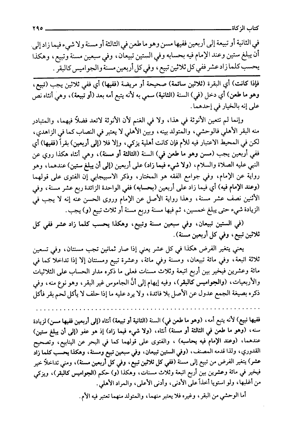 فِي الثَّانِيَة أَو تبيعة إِلَى أَرْبَعِينَ فَفِيهَا مسن وَهُوَ مَا طعن فِي الثَّالِثَة أَو مُسِنَّة وَلَا شَيْء فِيمَا زَاد إِلَى أَن يبلغ سِتِّينَ وَعند الإِمَام فِيهِ بِحِسَابِهِ وَفِي السِّتين تبيعان، وَفِي سبعين مُسِنَّة وتبيع، وَهَكَذَا يحْسب كلما زَاد عشر فَفِي كل ثَلَاثِينَ تبيع، وَفِي كل أَرْبَعِينَ مُسِنَّة والجواميس كالبقر.