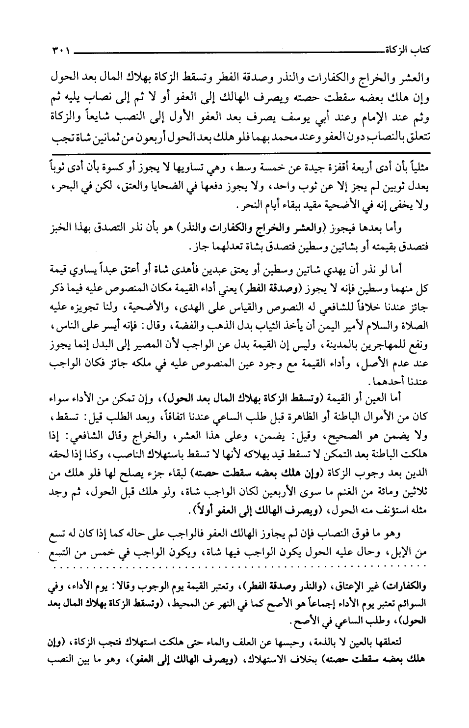 وَالْعشر وَالْخَرَاج وَالْكَفَّارَات وَالنّذر وَصدقَة الْفطر وَتسقط الزَّكَاة بِهَلَاك المَال بعد الْحول وَإِن هلك بعضه سَقَطت حِصَّته وَيصرف الْهَالِك إِلَى الْعَفو أَو لَا ثمَّ إِلَى نِصَاب يَلِيهِ ثمَّ وَثمّ عِنْد الإِمَام وَعند أبي يُوسُف يصرف بعد الْعَفو الأول إِلَى النصب شايعاً وَالزَّكَاة تتَعَلَّق بالنصاب دون الْعَفو وَعند مُحَمَّد بهما فَلَو هلك بعد الْحول أَرْبَعُونَ من ثَمَانِينَ شَاة تجب