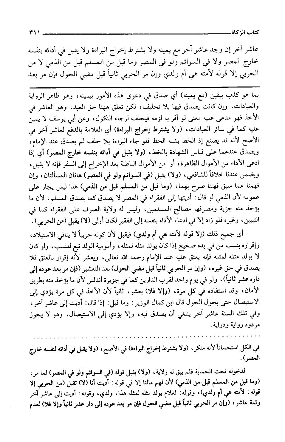 عَاشر آخر أَن وجد عَاشر آخر مَعَ يَمِينه وَلَا يشْتَرط إِخْرَاج الْبَرَاءَة وَلَا يقبل فِي أَدَائِهِ بِنَفسِهِ خَارج الْمصر وَلَا فِي السوائم وَلَا فِي الْمصر وَمَا قبل من الْمُسلم قبل من الذِّمِّيّ لَا من الْحَرْبِيّ إِلَّا قَوْله لأمته هِيَ أم وَلَدي وَإِن مر الْحَرْبِيّ ثَانِيًا قبل مُضِيّ الْحول فَإِن مر بعد
