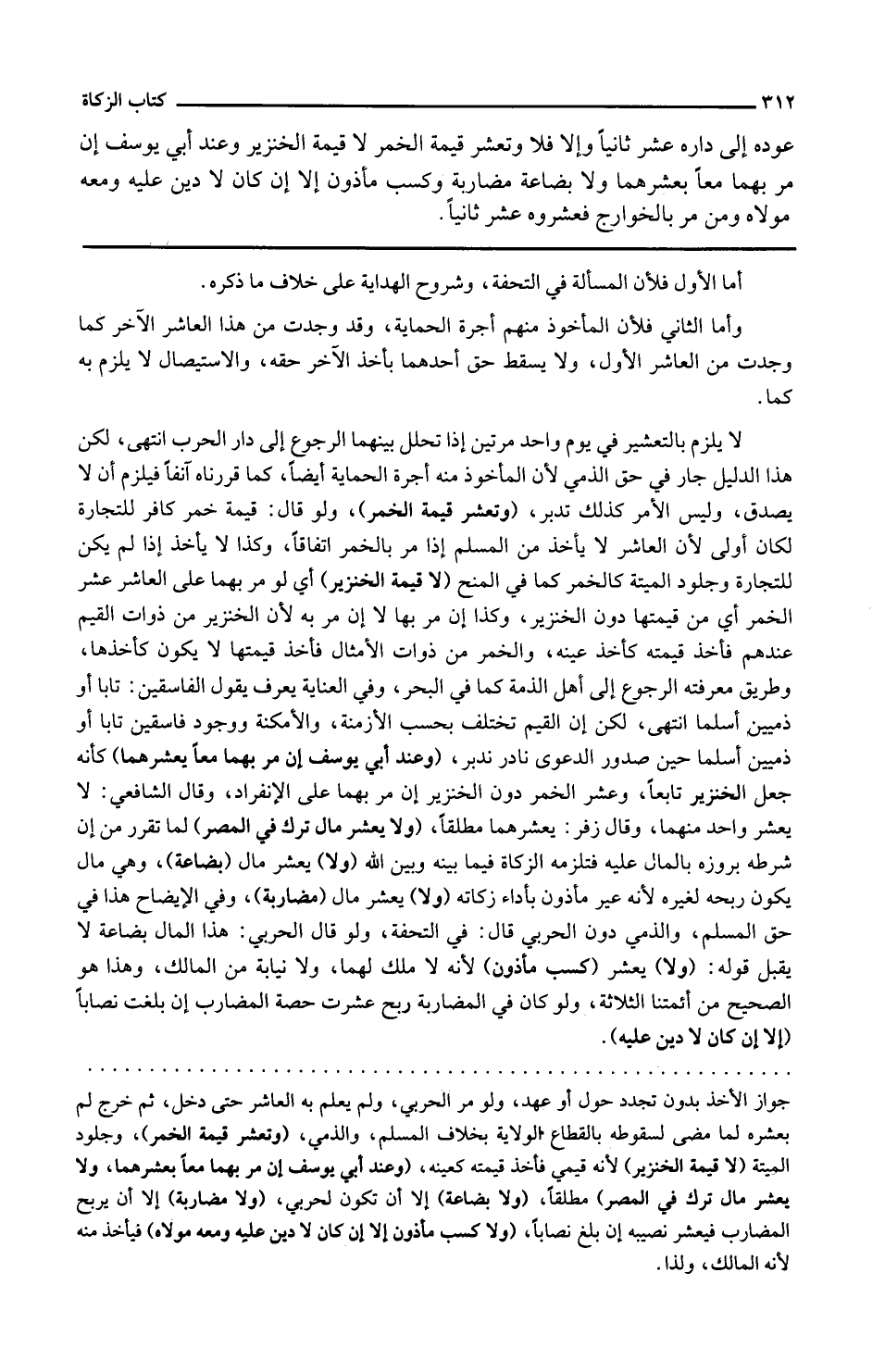 عوده إِلَى دَاره عشر ثَانِيًا وَإِلَّا فَلَا تعشر قيمَة الْخمر لَا قيمَة الْخِنْزِير وَعند أبي يُوسُف إِن مر بهما مَعًا بعشرهما وَلَا بضَاعَة مُضَارَبَة وَكسب مَأْذُون إِلَّا إِن كَانَ لَا دين عَلَيْهِ وَمَعَهُ مَوْلَاهُ وَمن مر بالخوارج فعشروه عشر ثَانِيًا.