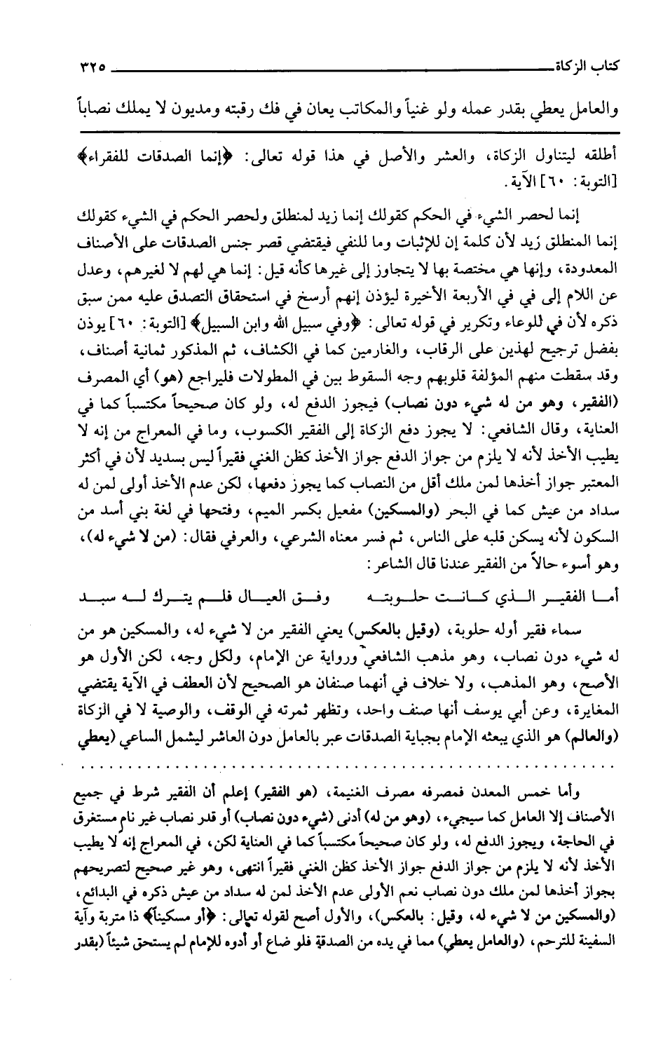 وَالْعَامِل يُعْطي بِقدر عمله وَلَو غَنِيا وَالْمكَاتب يعان فِي فك رقبته ومديون لَا يملك نِصَابا
