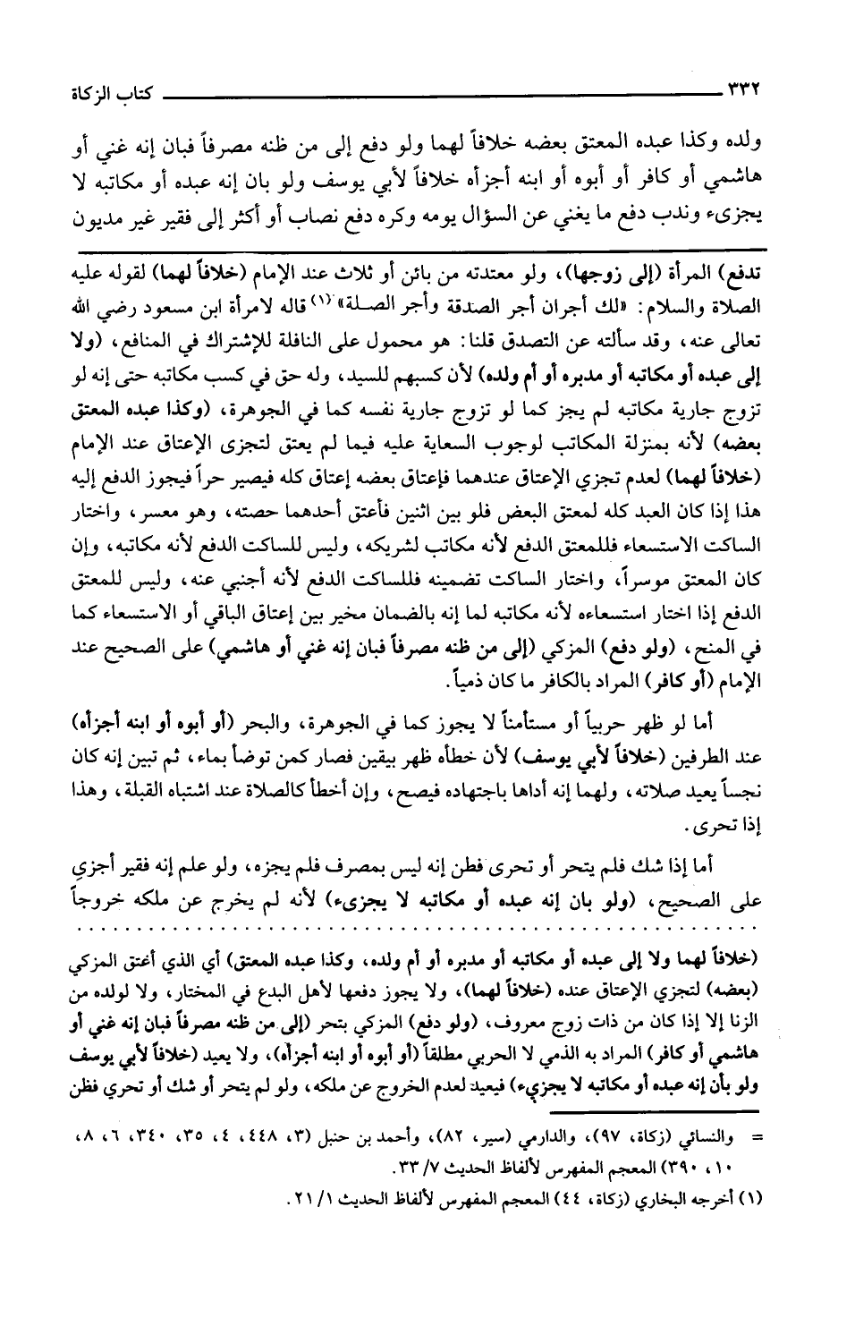 وَلَده وَكَذَا عَبده الْمُعْتق بعضه خلافًا لَهما وَلَو دفع إِلَى من ظَنّه مصرفاً فَبَان إِنَّه غَنِي أَو هاشمي أَو كَافِر أَو أَبوهُ أَو ابْنه أَجزَأَهُ خلافًا لأبي يُوسُف وَلَو بَان إِنَّه عَبده أَو مكَاتبه لَا يجزىء وَندب دفع مَا يُغني عَن السُّؤَال يَوْمه وَكره دفع نِصَاب أَو أَكثر إِلَى فَقير غير مديون