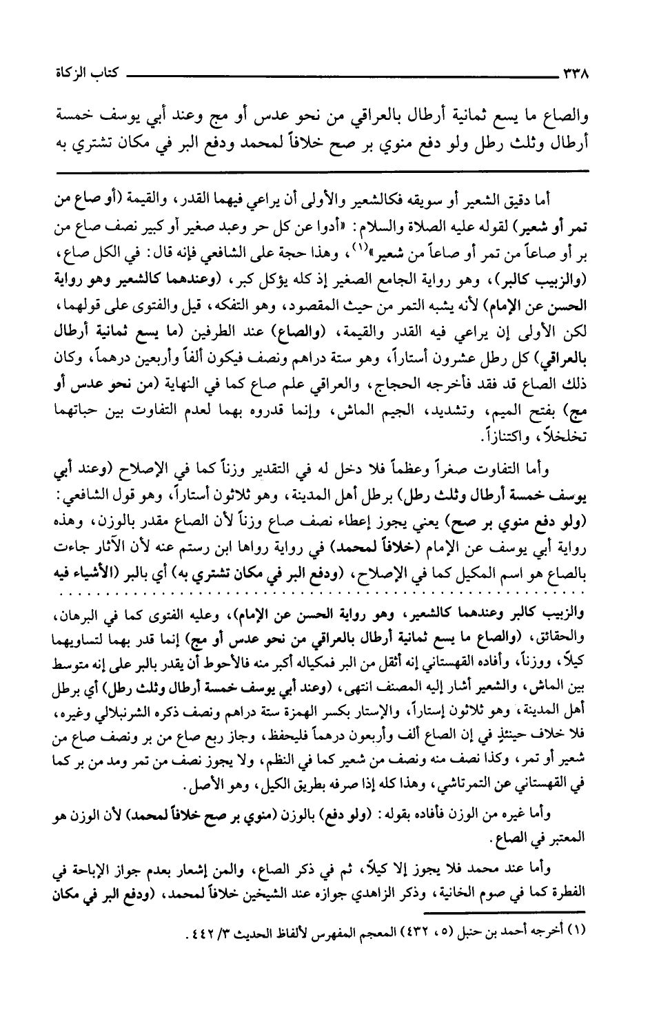والصاع مَا يسع ثَمَانِيَة أَرْطَال بالعراقي من نَحْو عدس أَو مج وَعند أبي يُوسُف خَمْسَة أَرْطَال وَثلث رَطْل وَلَو دفع منوي بر صَحَّ خلافًا لمُحَمد وَدفع الْبر فِي مَكَان تشتري بِهِ