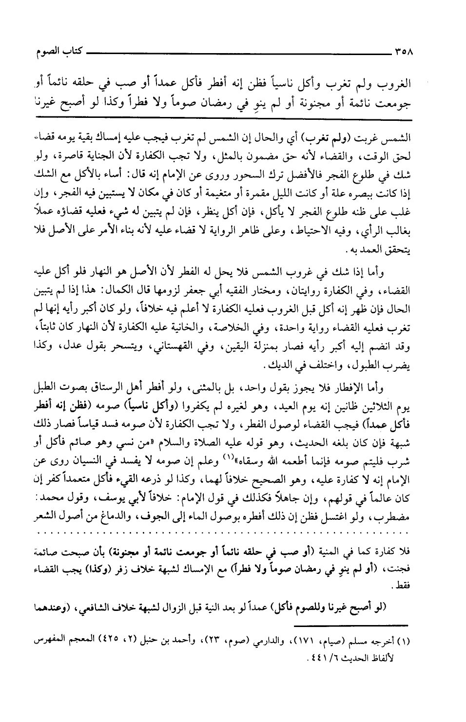الْغُرُوب وَلم تغربوأكل نَاسِيا فَظن إِنَّه أفطر فَأكل عمدا أَو صب فِي حلقه نَائِما أَو جومعت نَائِمَة أَو مَجْنُونَة أَو لم ينوِ فِي رَمَضَان صوما وَلَا فطراً وَكَذَا لَو أصبح غَيرنَا