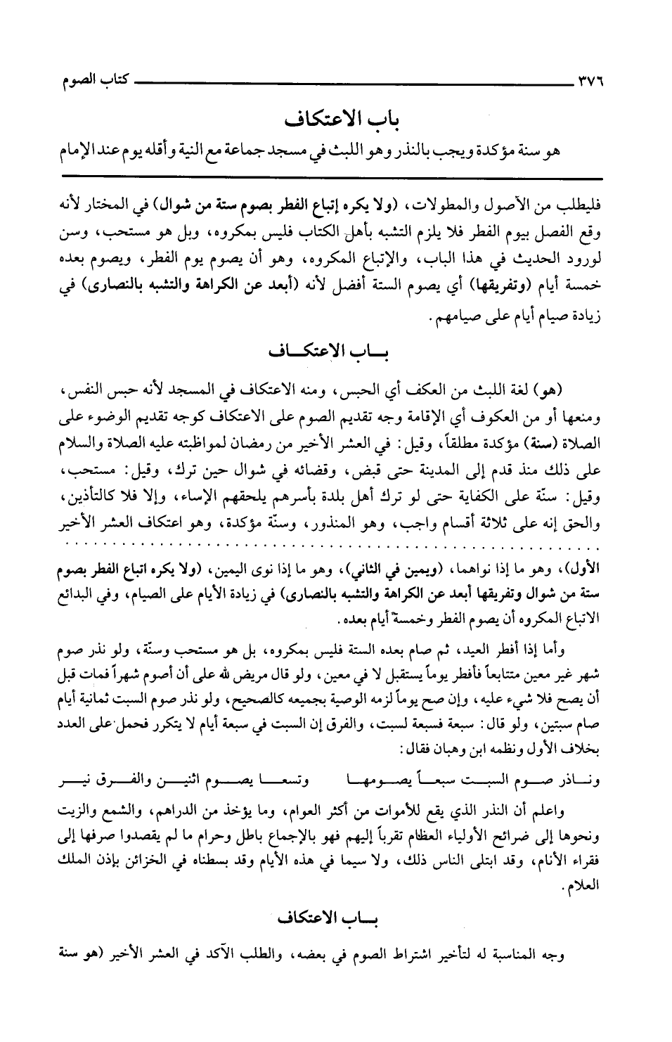هُوَ سنة مُؤَكدَة وَيجب بِالنذرِ وَهُوَ اللّّبْث فِي مَسْجِد جمَاعَة مَعَ النِّيَّة وَأقله يَوْم عِنْد الإِمَام