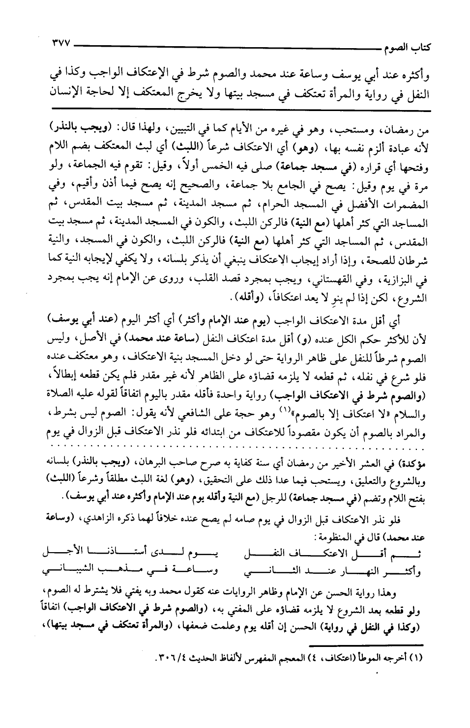 وَأَكْثَره عِنْد أبي يُوسُف وَسَاعَة عِنْد مُحَمَّد وَالصَّوْم شَرط فِي الإعتكاف الْوَاجِب وَكَذَا فِي النَّفْل فِي رِوَايَة وَالْمَرْأَة تعتكف فِي مَسْجِد بَيتهَا وَلَا يخرج الْمُعْتَكف إِلَّا لحَاجَة الْإِنْسَان