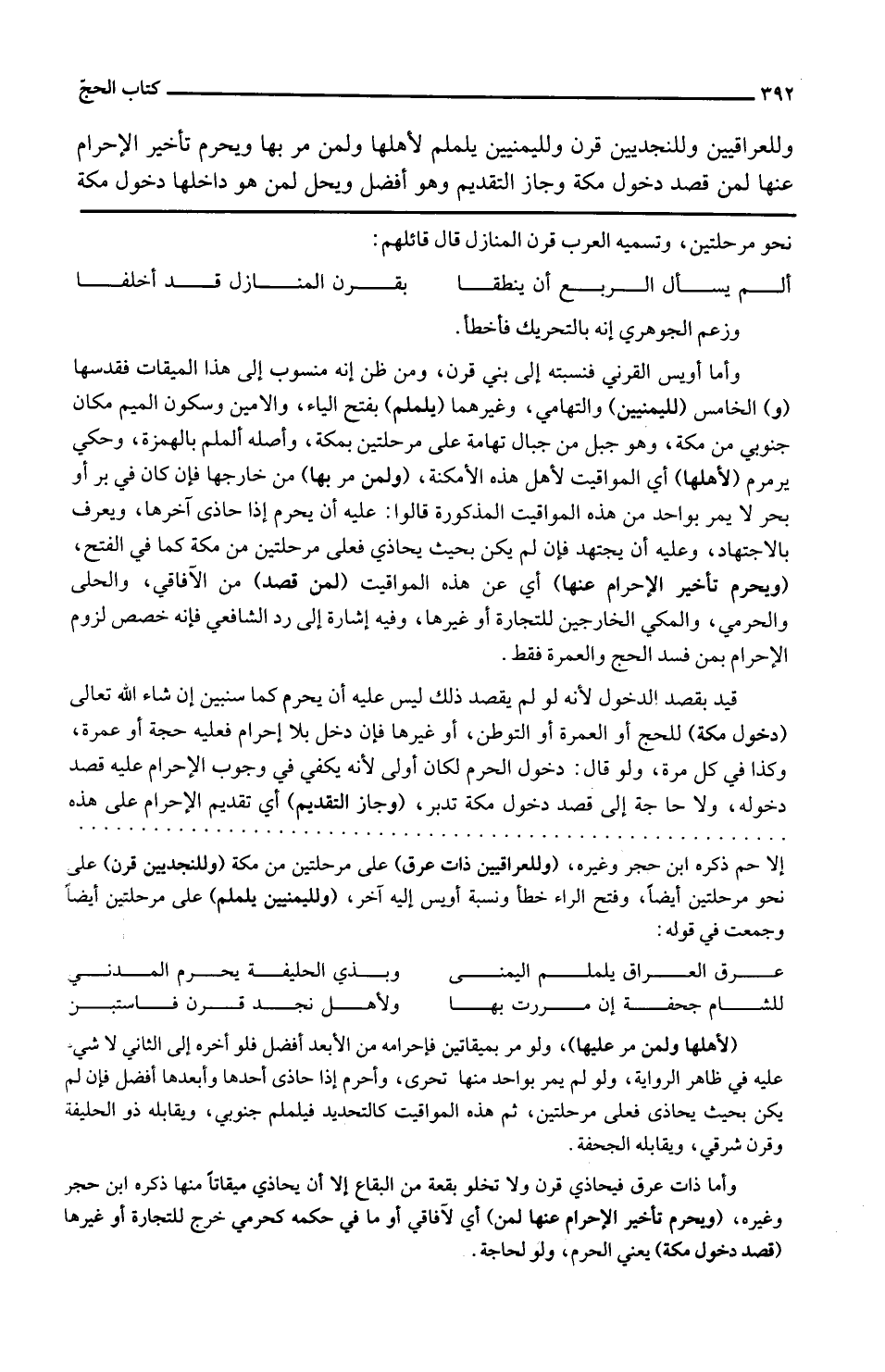وللعراقيين وللنجديين قرن ولليمنيين يَلَمْلَم لأَهْلهَا وَلمن مر بهَا وَيحرم تَأْخِير الْإِحْرَام عَنْهَا لمن قصد دُخُول مَكَّة وَجَاز التَّقْدِيم وَهُوَ أفضل وَيحل لمن هُوَ داخلها دُخُول مَكَّة