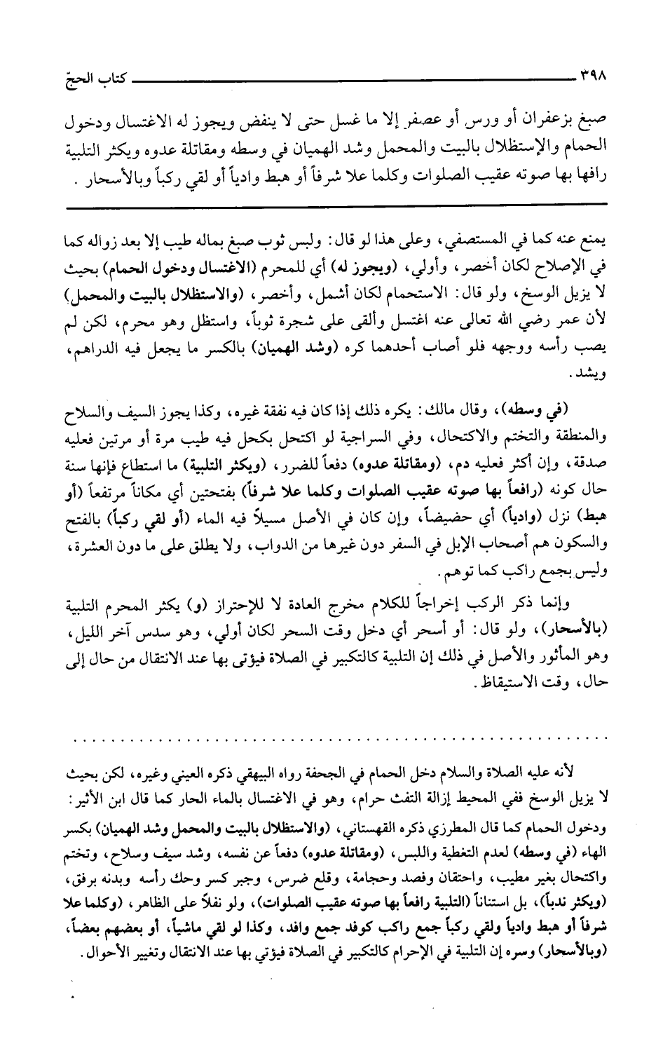 صبغ بزعفران أَو ورس أَو عصفر إِلَّا مَا غسل حَتَّى لَا ينفض وَيجوز لَهُ الِاغْتِسَال وَدخُول الْحمام والإستظلال بِالْبَيْتِ والمحمل وَشد الْهِمْيَان فِي وَسطه ومقاتلة عدوه وَيكثر التَّلْبِيَة رافها بهَا صَوته عقيب الصَّلَوَات وَكلما علا شرفاً أَو هَبَط وَاديا أَو لَقِي ركباً وبالأسحار.