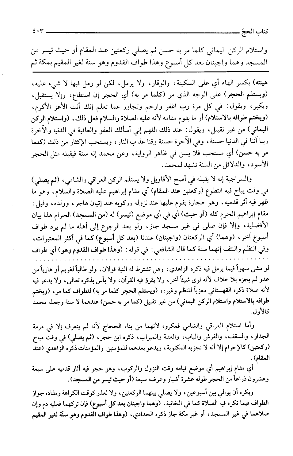 واستلام الرُّكْن الْيَمَانِيّ كلما مر بِهِ حسن ثمَّ يُصَلِّي رَكْعَتَيْنِ عِنْد الْمقَام أَو حَيْثُ تيَسّر من الْمَسْجِد وهما واجبتان بعد كل أُسْبُوع وَهَذَا طواف الْقدوم وَهُوَ سنة لغير الْمُقِيم بِمَكَّة ثمَّ