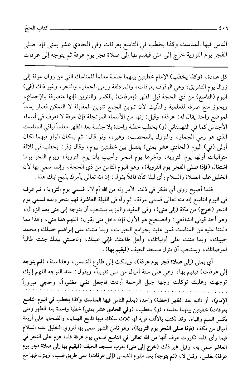 النَّاس فِيهَا الْمَنَاسِك وَكَذَا يخْطب فِي التَّاسِع بِعَرَفَات وَفِي الْحَادِي عشر بمنى فَإِذا صلى الْفجْر يَوْم التَّرويَة خرج إِلَى منى فيقيم بهَا إِلَى صَلَاة فجر يَوْم عَرَفَة ثمَّ يتَوَجَّه إِلَى عَرَفَات