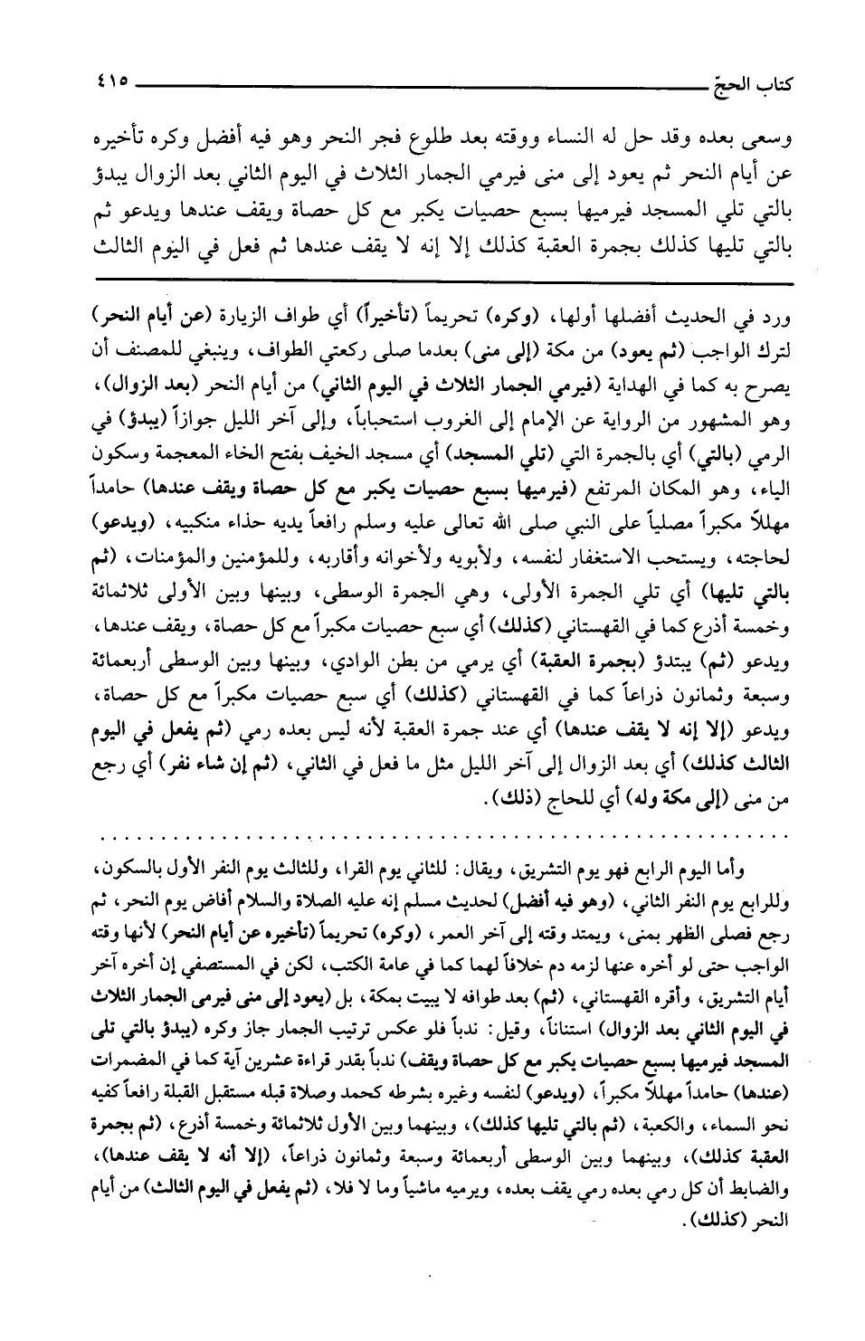 وسعى بعده وَقد حل لَهُ النِّسَاء وَوَقته بعد طُلُوع فجر النَّحْر وَهُوَ فِيهِ أفضل وَكره تَأْخِير عَن أَيَّام النَّحْر ثمَّ يعود إِلَى منى فَيَرْمِي الْجمار الثَّلَاث فِي الْيَوْم الثَّانِي بعد الزَّوَال ويبدؤ بِالَّتِي تلِي الْمَسْجِد فيرميها بِسبع حَصَيَات يكبر مَعَ كل حَصَاة وَيقف عِنْدهَا وَيَدْعُو ثمَّ بِالَّتِي تَلِيهَا كَذَلِك بجمرة الْعقبَة كَذَلِك إِلَّا إِنَّه لَا يقف عِنْدهَا ثمَّ فعل فِي الْيَوْم الثَّالِث