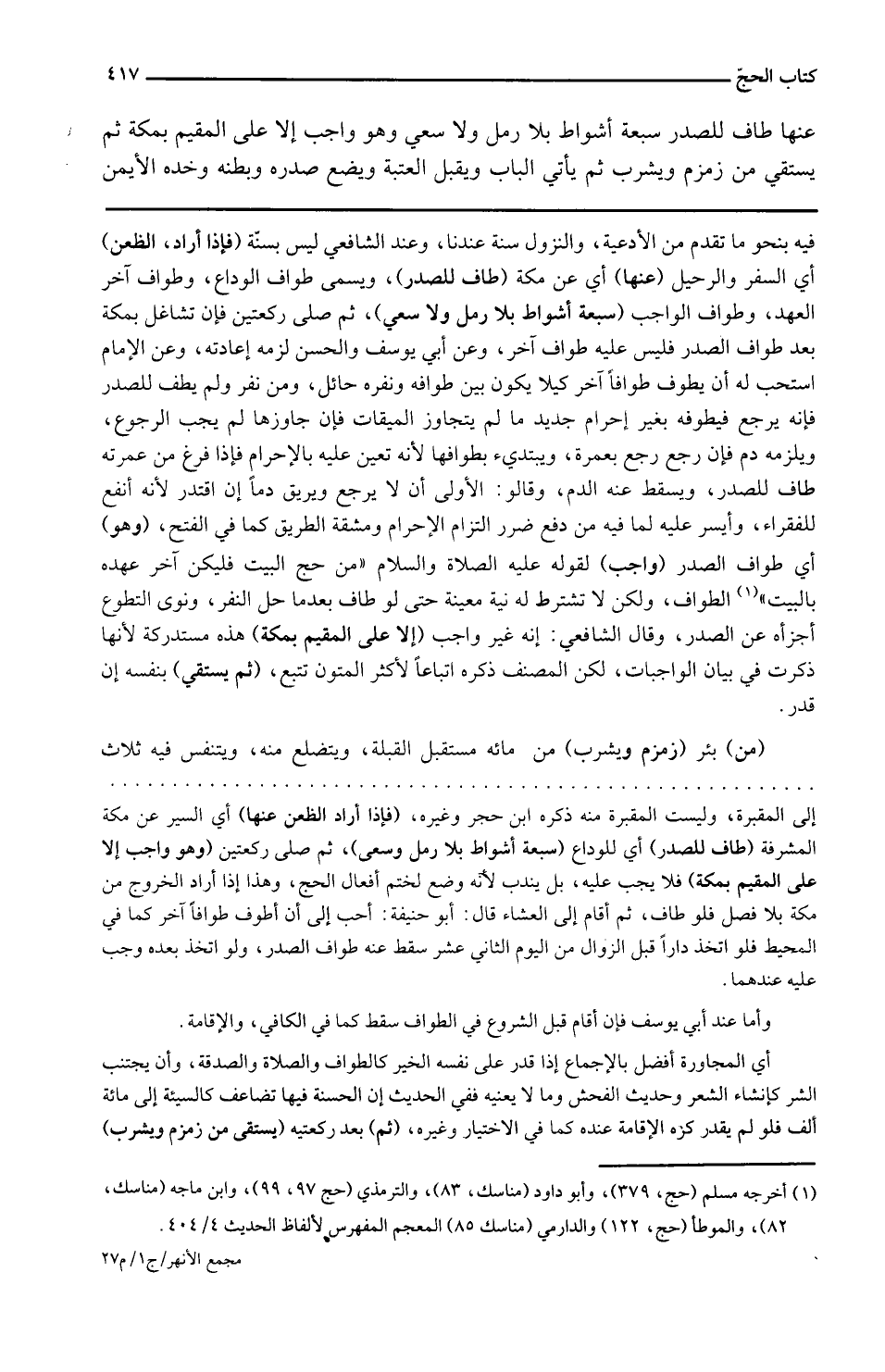 عَنْهَا طَاف للصدر سَبْعَة أَشْوَاط بِلَا رمل وَلَا سعي وَهُوَ وَاجِب إِلَّا على الْمُقِيم بِمَكَّة ثمَّ يَسْتَقِي من زَمْزَم وَيشْرب ثمَّ يَأْتِي الْبَاب وَيقبل العتبة وَيَضَع صَدره وبطنه وخده الْأَيْمن
