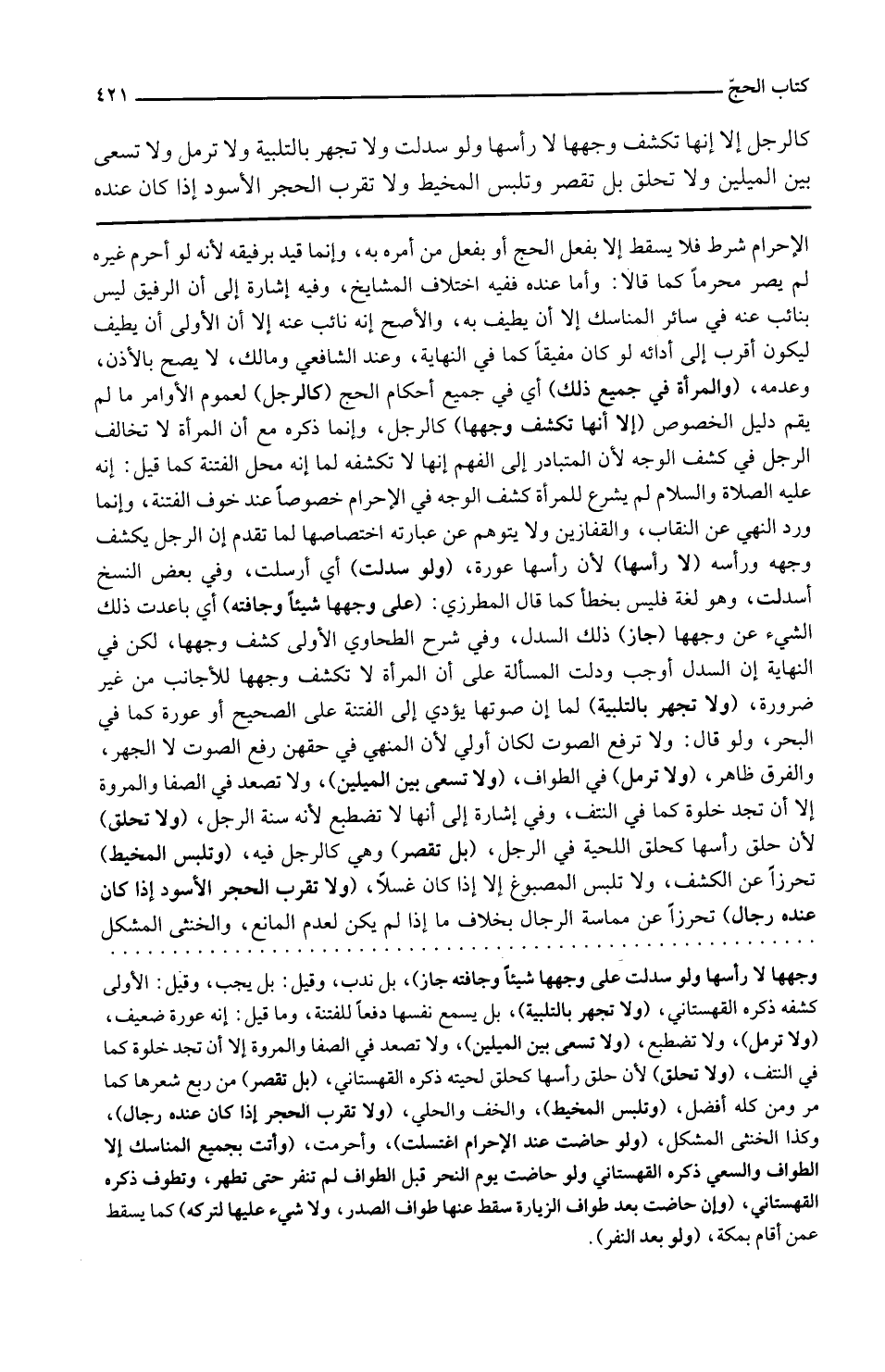 كَالرّجلِ إِلَّا أَنَّهَا تكشف وَجههَا لَا رَأسهَا وَلَو سدلت وَلَا تجْهر بِالتَّلْبِيَةِ وَلَا ترمل وَلَا تسْعَى بَين الميلين وَلَا تحلق بل تقصر وتلبس الْمخيط وَلَا تقرب الْحجر الْأسود إِذا كَانَ عِنْده
