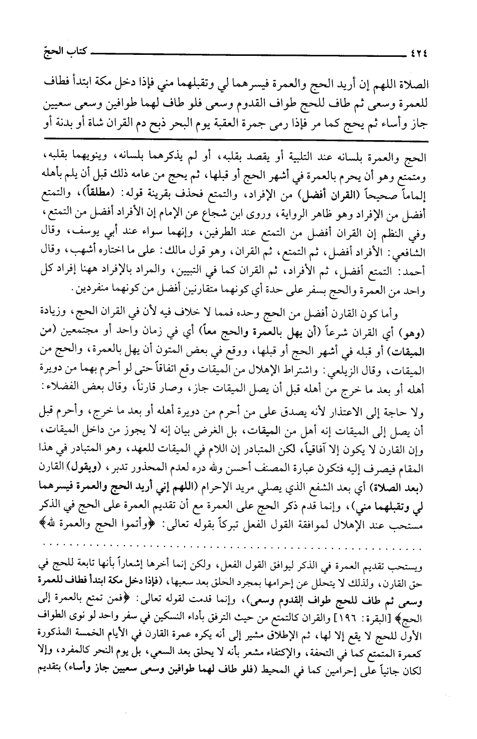 الصَّلَاة اللَّهُمَّ إِن أُرِيد الْحَج وَالْعمْرَة فيسرهما لي وتقبلهما مني فَإِذا دخل مَكَّة ابْتَدَأَ فَطَافَ للْعُمْرَة وسعى ثمَّ طَاف لِلْحَجِّ طواف الْقدوم وسعى فَلَو طَاف لَهما طوافين وسعى سعيين جَازَ وأساء ثمَّ يحجّ كَمَا مر فَإِذا رمى جَمْرَة الْعقبَة يَوْم النَّحْر ذبح دم الْقرَان شَاة أَو بَدَنَة أَو