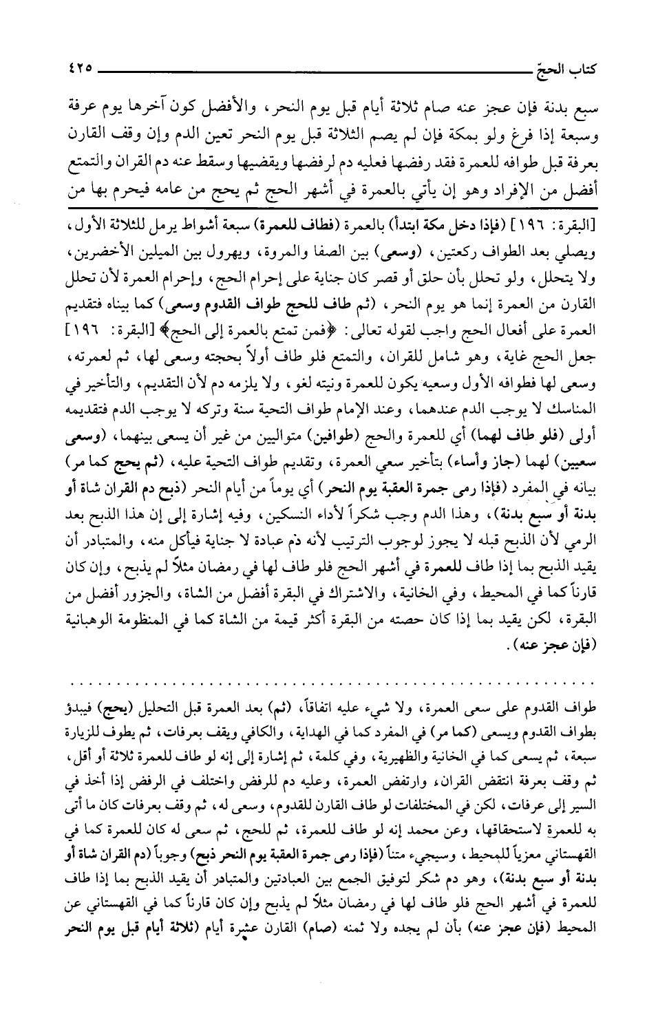 سبع بَدَنَة فَإِن عجز عَنهُ صَامَ ثَلَاثَة أَيَّام قبل يَوْم النَّحْر، وَالْأَفْضَل كَون آخرهَا يَوْم عَرَفَة وَسَبْعَة إِذا فرغ وَلَو بِمَكَّة فَإِن لم يصم الثَّلَاثَة قبل يَوْم النَّحْر تعين الدَّم وَإِن وقف الْقَارِن بِعَرَفَة قبل طَوَافه للْعُمْرَة فقد رفضها فَعَلَيهِ دم لرفضها ويقضيها وَسقط عَنهُ دم الْقرَان والتمتع أفضل من الْإِفْرَاد وَهُوَ إِن يَأْتِي بِالْعُمْرَةِ فِي أشهر الْحَج ثمَّ يحجّ من عَامه فَيحرم بهَا من