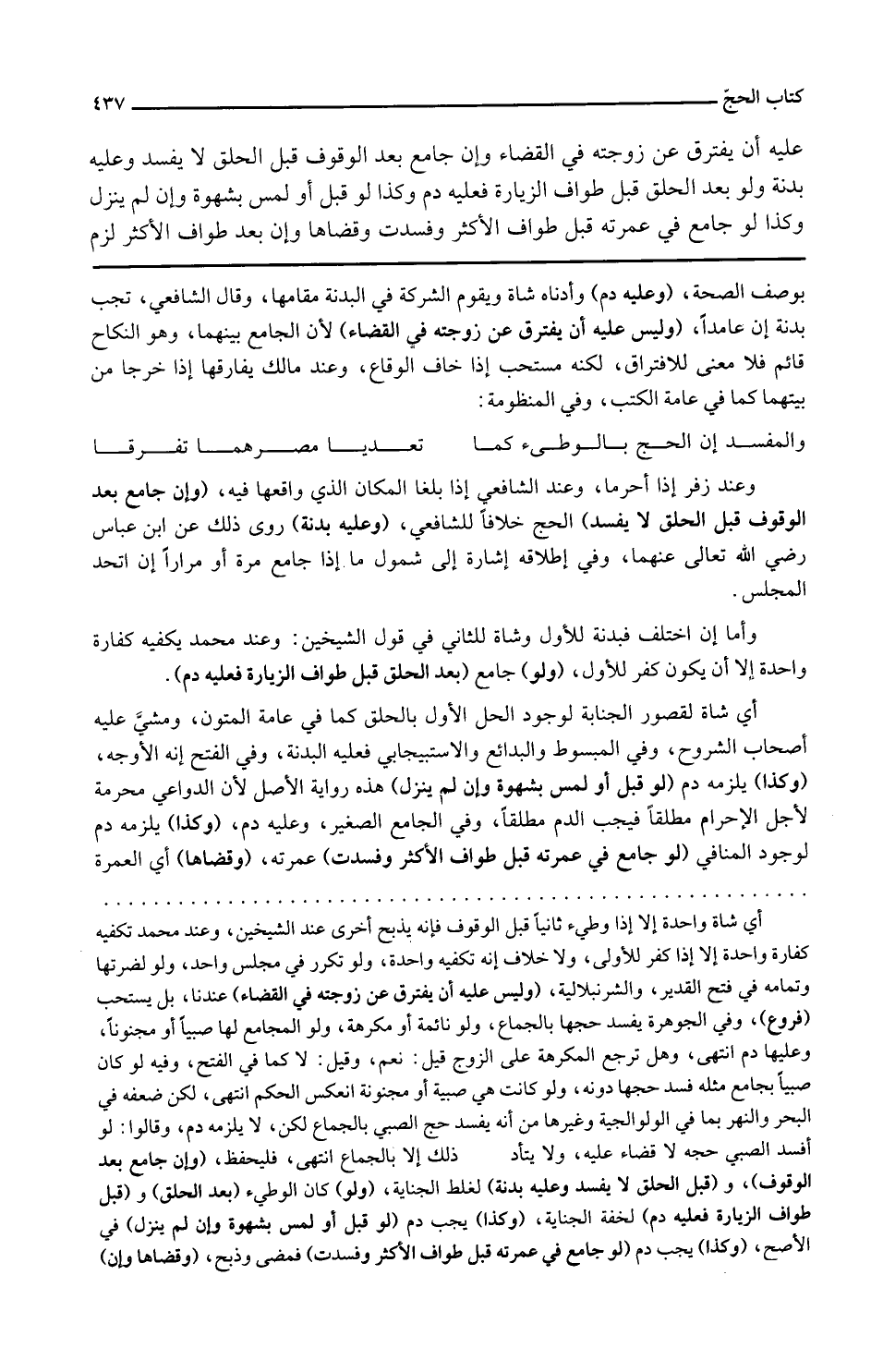 عَلَيْهِ أَن يفْتَرق عَن زَوجته فِي الْقَضَاء وَإِن جَامع بعد الْوُقُوف قبل الْحلق لَا يفْسد وَعَلِيهِ بَدَنَة وَلَو بعد الْحلق قبل طواف الزِّيَارَة فَعَلَيهِ دم وَكَذَا لَو قبل أَو لمس بِشَهْوَة وَإِن لم ينزل وَكَذَا لَو جَامع فِي عمرته قبل طواف الْأَكْثَر وفسدت وقضاها وَإِن بعد طواف الْأَكْثَر لزم