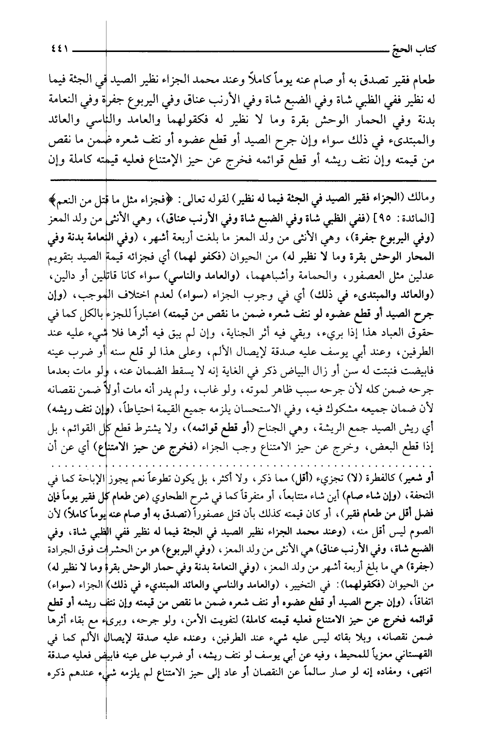 طَعَام فَقير تصدق بِهِ أَو صَامَ عَنهُ يَوْمًا كَامِلا وَعند مُحَمَّد الْجَزَاء نَظِير الصَّيْد فِي الجثة فِيمَا لَهُ نَظِير فَفِي الظبي شَاة وَفِي الضبع شَاة وَفِي الأرنب عنَاق وَفِي اليربوع جفرة وَفِي النعامة بَدَنَة وَفِي الْحمار الْوَحْش بقرة وَمَا لَا نَظِير لَهُ فكقولهما والعامد وَالنَّاسِي والعائد والمبتدىء فِي ذَلِك سَوَاء وَإِن جرح الصَّيْد أَو قطع عضوه أَو نتف شعره ضمن مَا نقص من قِيمَته وَإِن نتف ريشه أَو قطع قوائمه فَخرج عَن حيّز الإمتناع فَعَلَيهِ قِيمَته كَامِلَة وَإِن