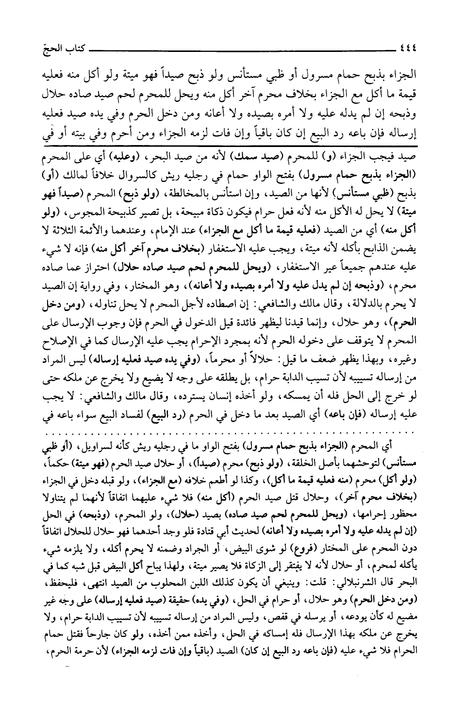 الْجَزَاء بِذبح حمام مسرول أَو ظَبْي مستأنس وَلَو ذبح صيدا فَهُوَ ميتَة وَلَو أكل مِنْهُ فَعَلَيهِ قيمَة مَا أكل مَعَ الْجَزَاء بِخِلَاف محرم آخر أكل مِنْهُ وَيحل للْمحرمِ لحم صيد صَاده حَلَال وذبحه إِن لم يدله عَلَيْهِ وَلَا أمره بصيده وَلَا أَعَانَهُ وَمن دخل الْحرم وَفِي يَده صيد فَعَلَيهِ إرْسَاله فَإِن بَاعه رد البيع وَإِن كَانَ بَاقِيا وَإِن فَاتَ لزمَه الْجَزَاء وَمن أحرم وَفِي بَيته أَو فِي