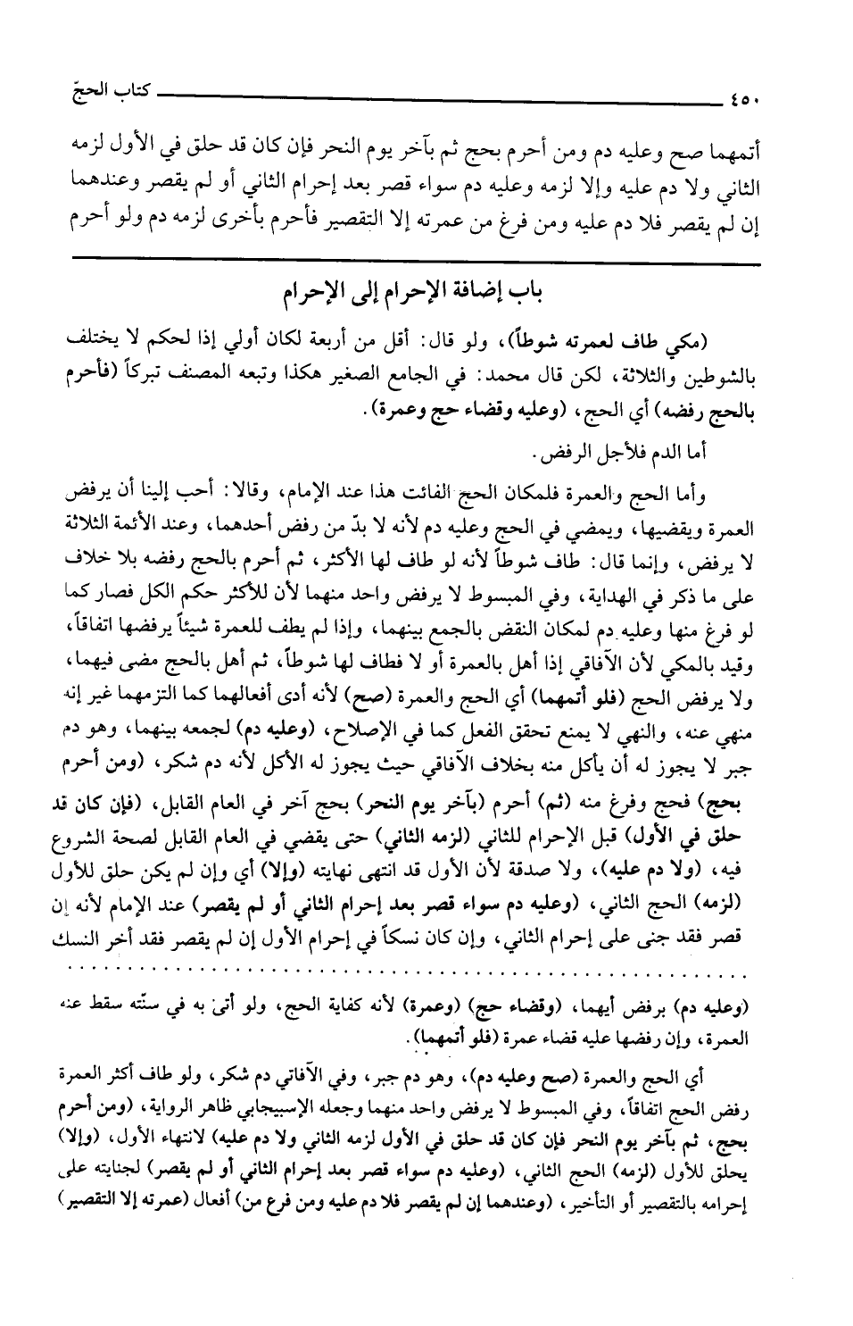 أتمهما صَحَّ عَلَيْهِ دم وَمن أحرم بِحَجّ ثمَّ بآخر يَوْم النَّحْر فَإِن كَانَ قد حلق فِي الأول لزمَه الثَّانِي وَلَا دم عَلَيْهِ وَإِلَّا لزمَه دم سَوَاء قصر بعد إِحْرَام الثَّانِي أَو لم يقصر وَعِنْدَهُمَا إِن لم يقصر فَلَا دم عَلَيْهِ وَمن فرغ من عمرته إِلَّا التَّقْصِير فَأحْرم باُخرى لزمَه دم وَلَو أحرم