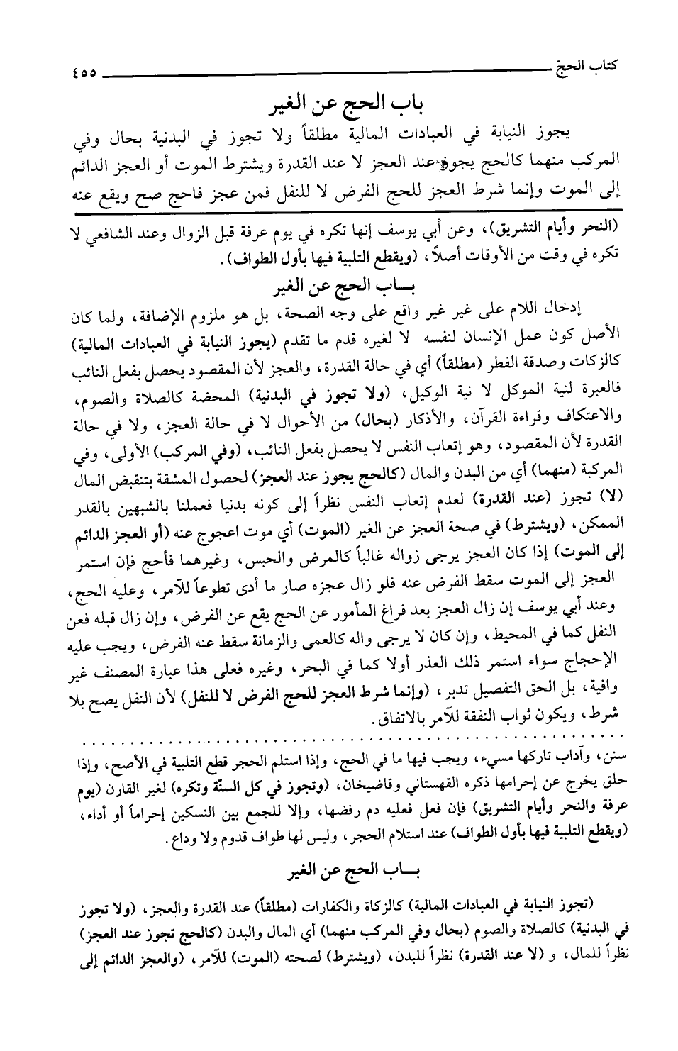 يجوز النِّيَابَة فِي الْعِبَادَات الْمَالِيَّة مُطلقًا وَلَا تجوز فِي الْبَدَنِيَّة بِحَال وَفِي الْمركب مِنْهُمَا كَالْحَجِّ يجوز عِنْد الْعَجز لَا الْقُدْرَة وَيشْتَرط الْمَوْت أَو الْعَجز الدَّائِم إِلَى الْمَوْت وَإِنَّمَا شَرط الْعَجز لِلْحَجِّ الْفَرْض لَا للنفل فَمن عجز فأحج صَحَّ وَيَقَع عَنهُ