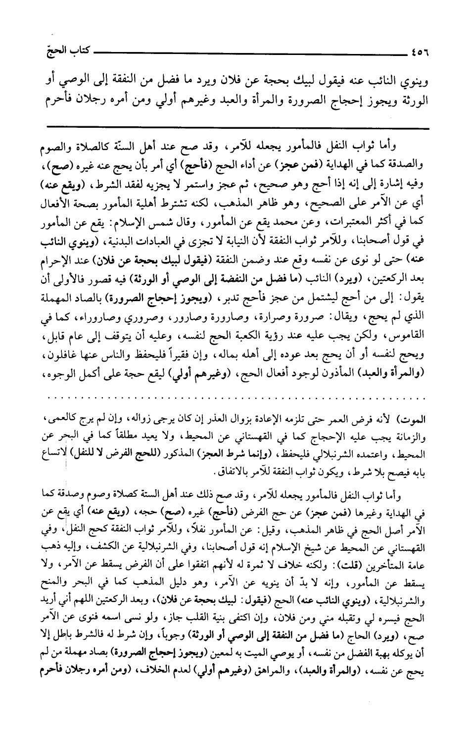 وَيَنْوِي النَّائِب عَنهُ فَيَقُول لبيْك بِحجَّة عَن فلَان وَيرد مَا فضل من النَّفَقَة إِلَى الْوَصِيّ أَو الْوَرَثَة وَيجوز إحجاج الصرورة وَالْمَرْأَة وَالْعَبْد وَغَيرهم أولي وَمن أمره رجلَانِ فَأحْرم