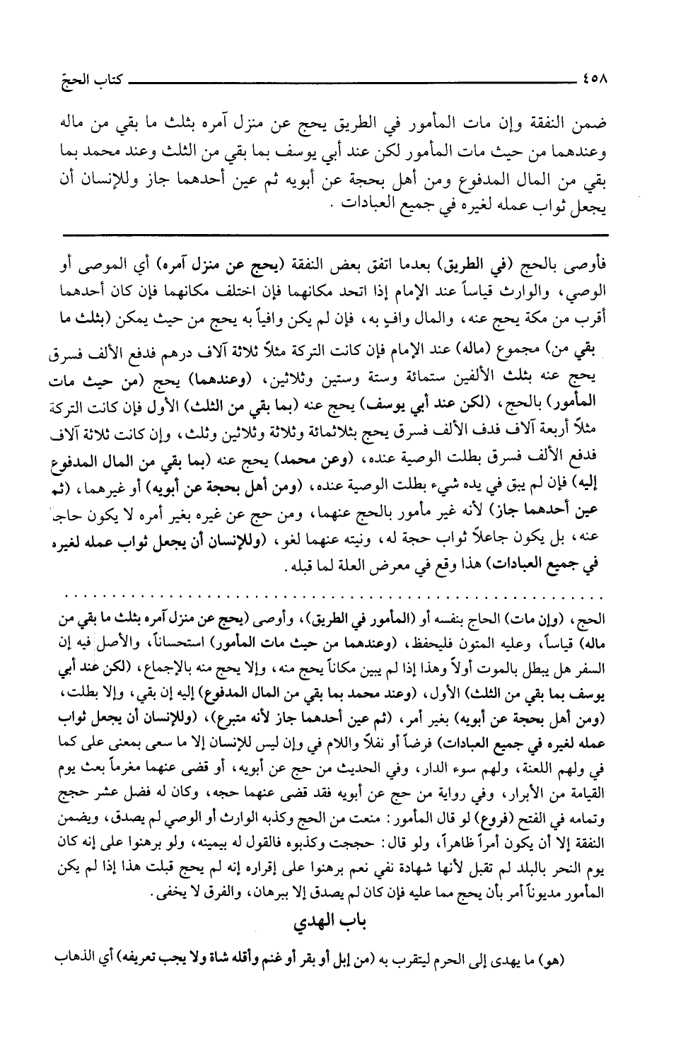 ضمن النَّفَقَة وَإِن مَاتَ الْمَأْمُور فِي الطَّرِيق يحجّ عَن منزل آمره بِثلث مَا بَقِي من مَاله وَعِنْدَهُمَا من حَيْثُ مَاتَ الْمَأْمُور لَكِن عِنْد أبي يُوسُف يما بَقِي من الثُّلُث وَعند مُحَمَّد بِمَا بَقِي من المَال الْمَدْفُوع وَمن أهل بِحجَّة عَن أَبَوَيْهِ ثمَّ عين أَحدهمَا جَازَ وللإنسان أَن يَجْعَل ثوب عمله لغيره فِي جَمِيع الْعِبَادَات.