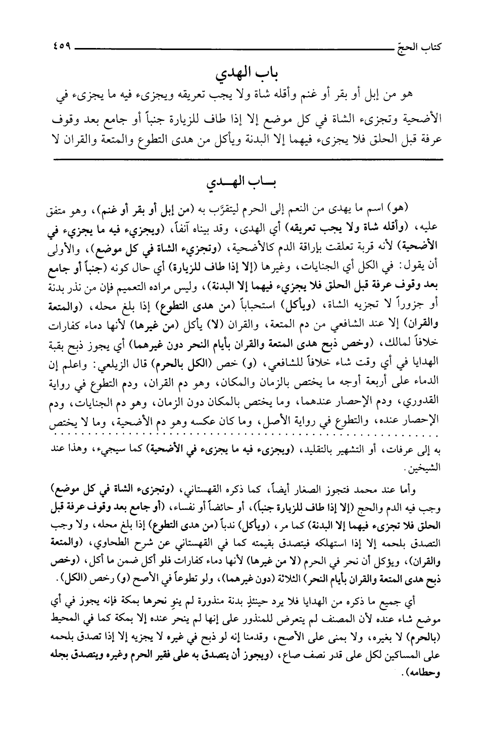 هُوَ من إبل أَو بقر أَو غنم وَأقله شَاة وَلَا يجب تعريقه ويجزىء فِيهِ مَا يجزىء فِي الْأُضْحِية وتجزىء الشَّاة فِي كل مَوضِع إِلَّا إِذا طَاف للزيارة جنبا أَو جَامع بعد وقُوف عَرَفَة قبل الْحلق فَلَا يجزىء فيهمَا إِلَّا الْبَدنَة وَيَأْكُل من هدي التَّطَوُّع والمتعة وَالْقرَان لَا