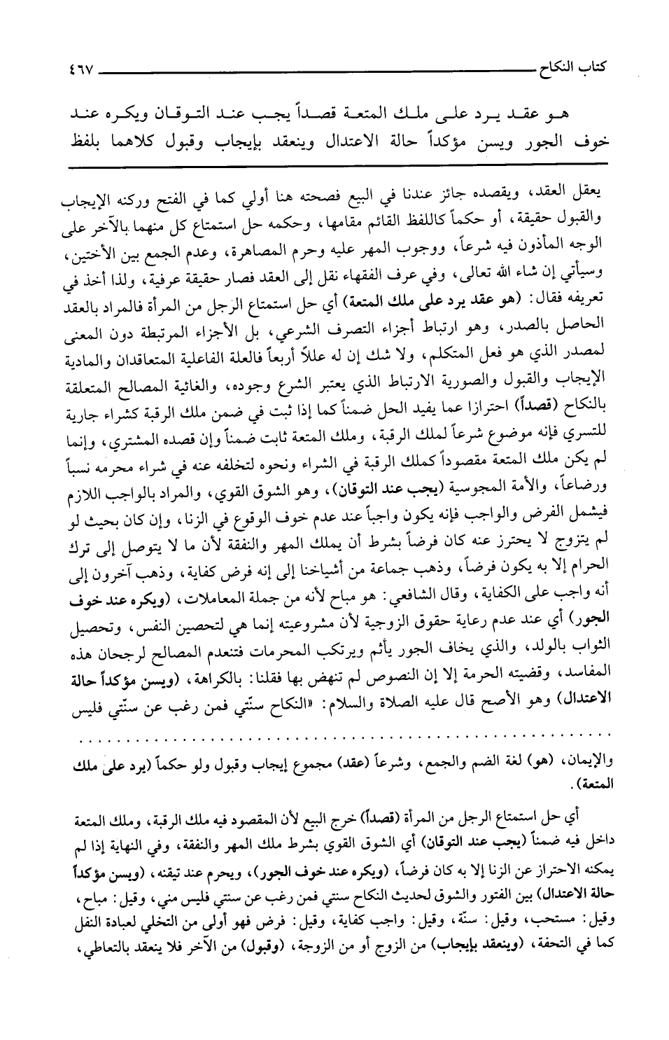 هُوَ عقد يرد على ملك الْمُتْعَة قصدا يجب عِنْد التوقان وَيكرهُ عِنْد خوف الْجور وَيسن مؤكداً حَالَة الِاعْتِدَال وَينْعَقد بِإِيجَاب وَقبُول كِلَاهُمَا بِلَفْظ