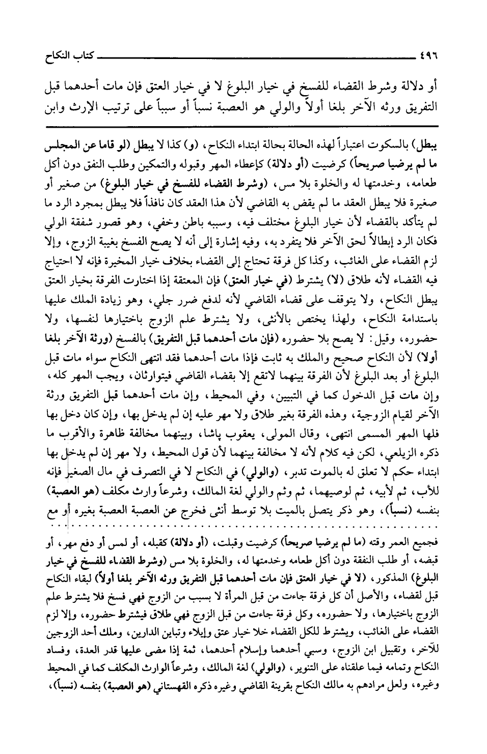 أَو دلَالَة وَشرط الْقَضَاء للْفَسْخ فِي خِيَار الْبلُوغ لَا فِي خِيَار الْعتْق فَإِن مَاتَ أَحدهمَا قبل التَّفْرِيق وَرَثَة الآخر بلغا أَو لَا وَالْوَلِيّ هُوَ الْعصبَة نسبا أَو سَببا على تَرْتِيب الْإِرْث وَابْن