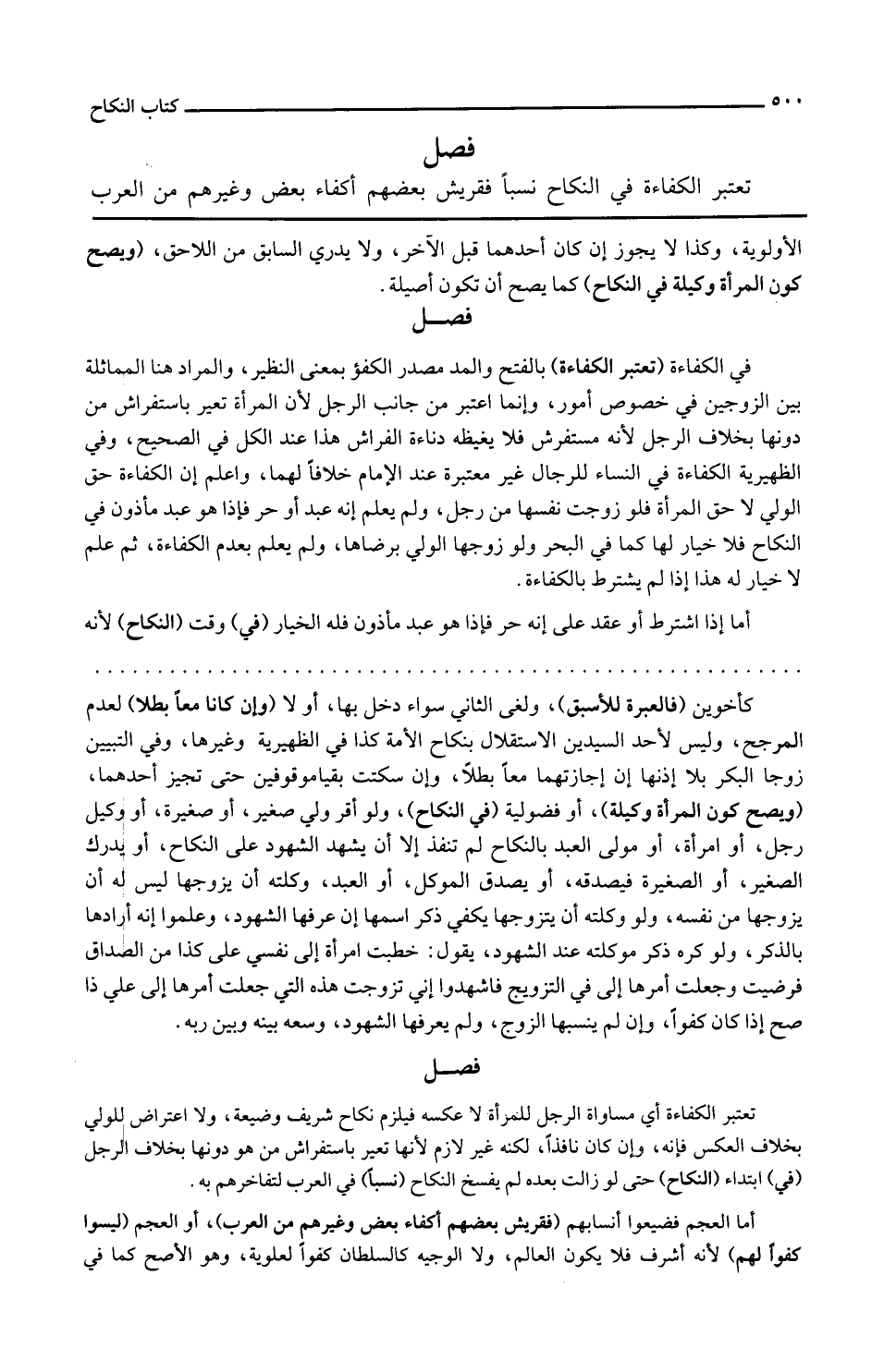 تعْتَبر الْكَفَاءَة فِي النِّكَاح نسبا فقريش بَعضهم أكفاء بعض وَغَيرهم من الْعَرَب