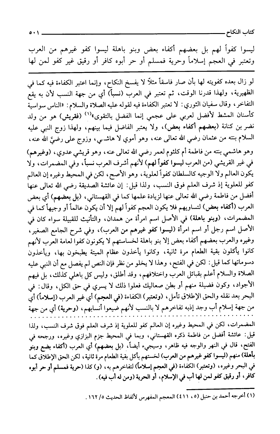 لَيْسُوا كفوا لَهُم بل بَعضهم أكفاء بعض وَبَنُو باهلة لَيْسُوا كفو غَيرهم من الْعَرَب وَتعْتَبر فِي الْعَجم إسلاماً وحرية فَمُسلم أَو حر أَبوهُ كَافِر أَو رَقِيق غير كفو لمن لَهَا