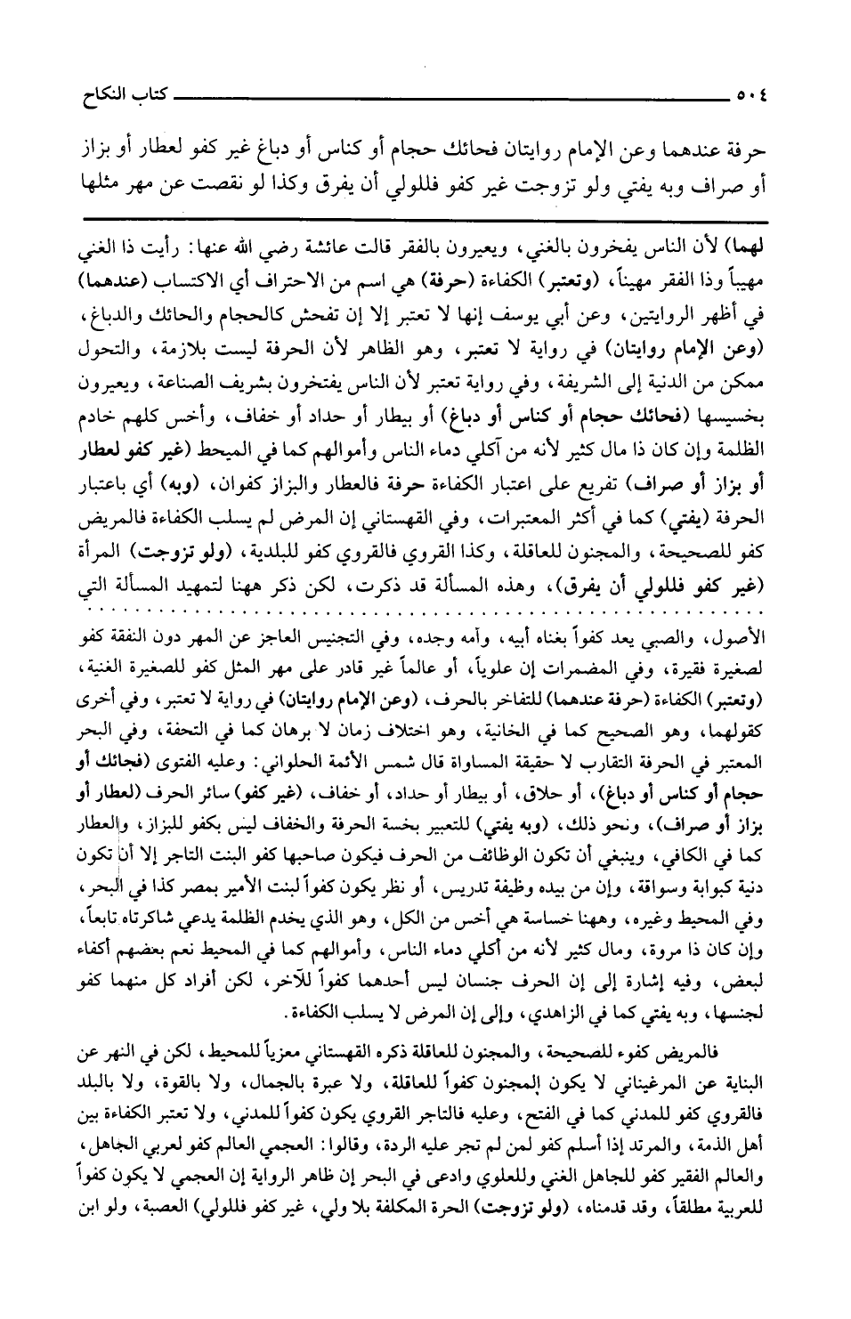 حِرْفَة عِنْدهمَا وَعَن الإِمَام رِوَايَتَانِ فحائك حجام أَو كناس أَو دباغ غير كفو لعطار أَو بزاز أَو صراف وَبِه يُفْتِي وَلَو تزوجت غير كفو فللولي أَن يفرق وَكَذَا لَو نقصت عَن مهر مثلهَا