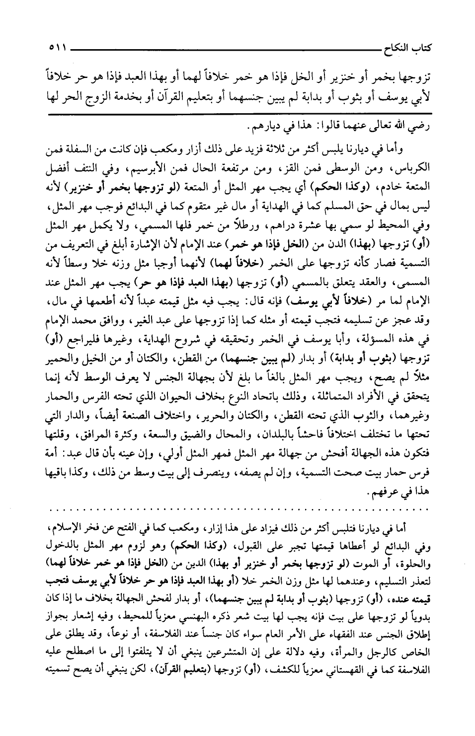 تزَوجهَا بِخَمْر أَو خِنْزِير أَو الْخلّ فَإِذا هُوَ خلافًا لَهما أَو بِهَذَا العَبْد فَإِذا هُوَ حر خلافًا لأبي يُوسُف أَو بِثَوْب أَو بِدَابَّة لم يبين جنسهما أَو بتعليم الْقُرْآن أَو بِخِدْمَة الزَّوْج الْحر لَهَا