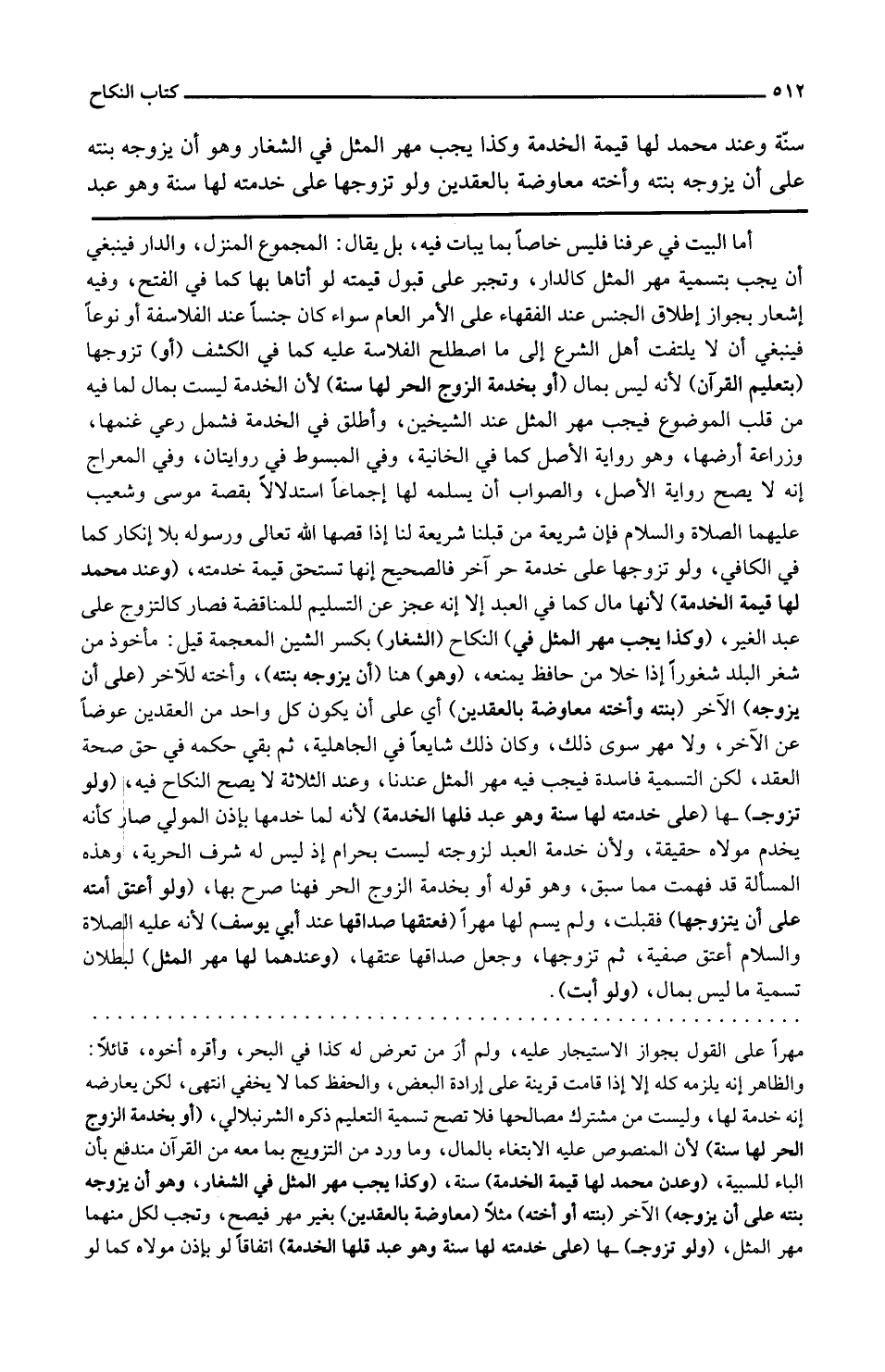 سنّة وَعند مُحَمَّد لَهَا قيمَة الْخدمَة وَكَذَا يجب مهر الْمثل فِي الشّغَار وَهُوَ أَن يُزَوجهُ بنته على أَن يُزَوجهُ بنته وَأُخْته مُعَاوضَة بالعقدين وَلَو تزَوجهَا على خدمته لَهَا سنة وَهُوَ عبد