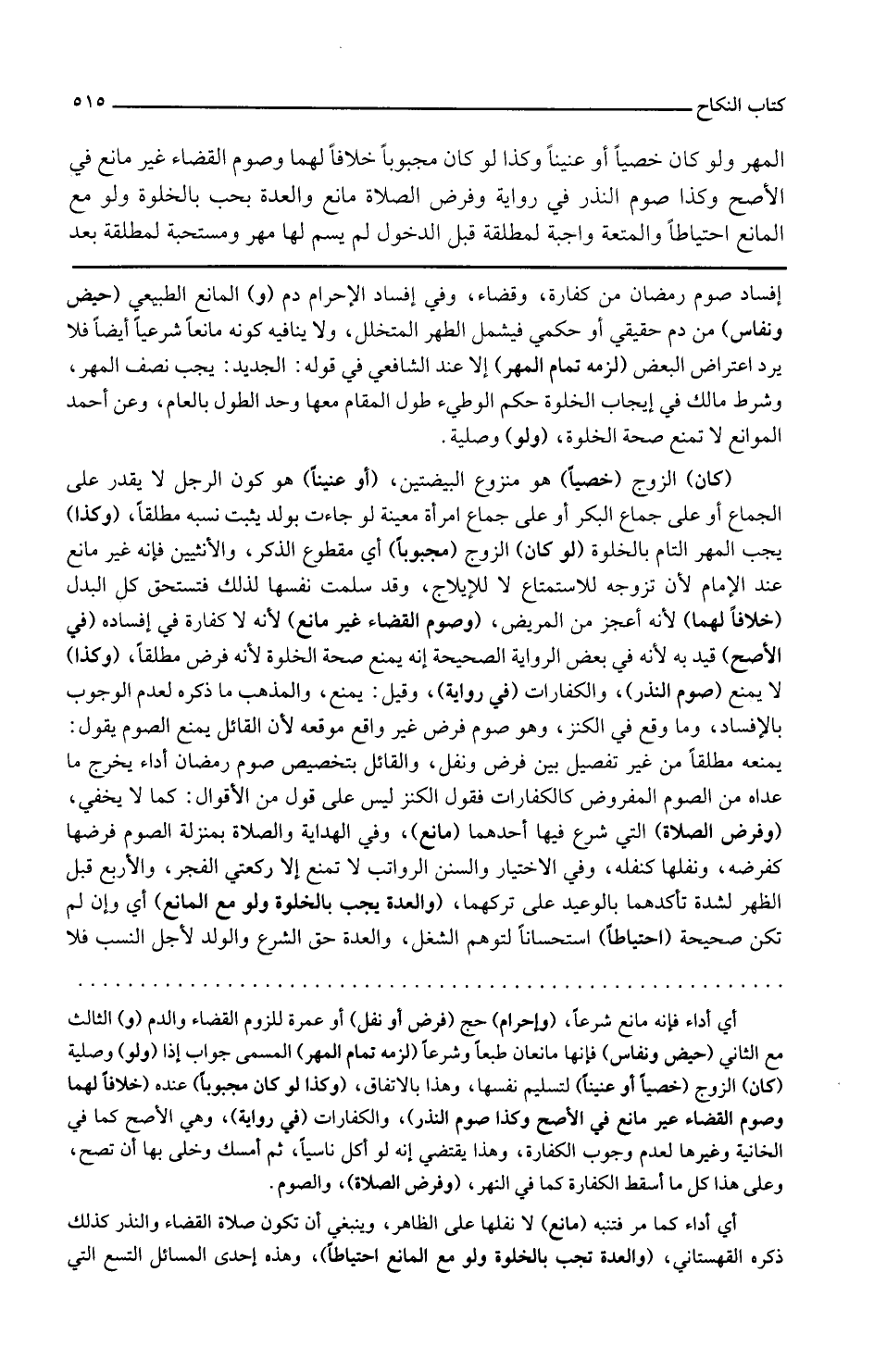 الْمهْر وَلَو كَانَ خَصيا أَو عنيناً وَكَذَا لَو كَانَ مجبوباً خلافًا لَهما وَصَوْم الْقَضَاء غير مَانع فِي الْأَصَح وَكَذَا صَوْم النّذر فِي رِوَايَة وَفرض الصَّلَاة مَانع وَالْعدة بحب بالخلوة وَلَو مَعَ الْمَانِع احْتِيَاطًا والمتعة وَاجِبَة لمطلقة قبل الدُّخُول لم يسم لَهَا مهر ومستحبة لمطلقة بعد