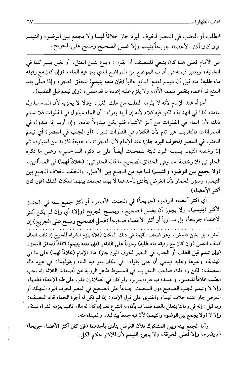 الطّلب أَو الْجنب فِي الْمصر لخوف الْبرد جَازَ خلافًا لَهما وَلَا يجمع بَين الْوضُوء وَالتَّيَمُّم فَإِن كَانَ أَكثر الْأَعْضَاء جريحاً يتَيَمَّم وَإِلَّا غسل الصَّحِيح وَمسح على الجريح.