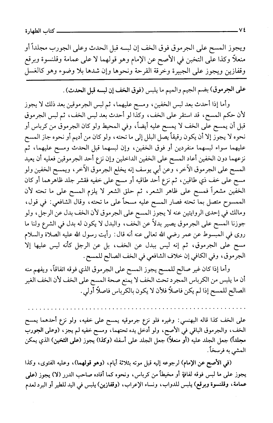 وَيجوز الْمسْح على الجرموق فَوق الْخُف إِن لبسه قبل الْحَدث وعَلى الجورب مجلداً أَو منعلاً وَكَذَا على التخبن فِي الْأَصَح عَن الإِمَام وَهُوَ قَوْلهمَا لَا على عِمَامَة وقلنسوة وبرقع وقفازين وَيجوز على الْجَبِيرَة وخرقة القرحة وَنَحْوهَا وَإِن شدها بِلَا وضوء وَهُوَ كالغسل