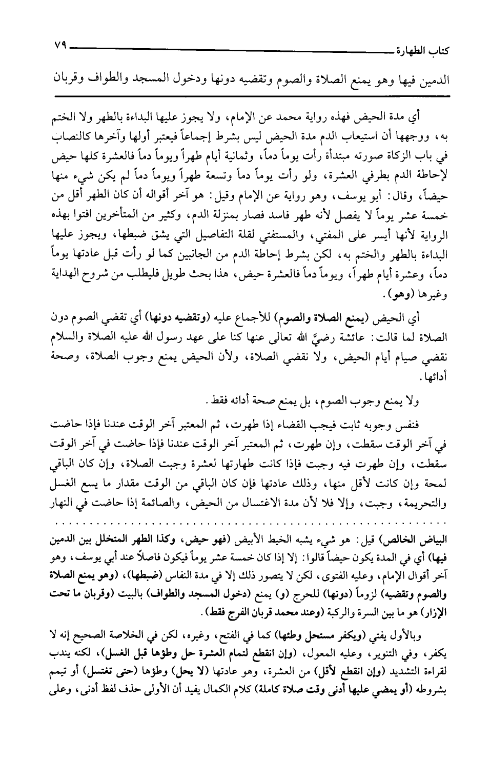 الدمين فِيهَا وَهُوَ يمْنَع الصَّلَاة وَالصَّوْم وتقضيه دونهَا وَدخُول الْمَسْجِد وَالطّواف وقربان