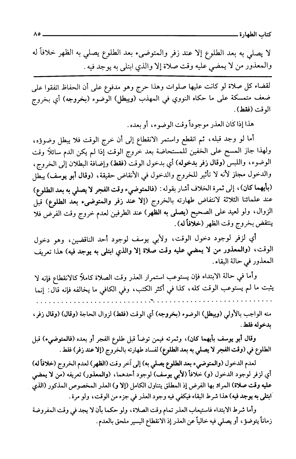 لَا يُصَلِّي بِهِ بعد الطُّلُوع إِلَّا عِنْد زفر والمتوضىء بعد الطُّلُوع يُصَلِّي بِهِ الظّهْر خلافًا لَهُ والمعذور من لَا يمْضِي عَلَيْهِ وَقت صَلَاة إِلَّا وَالَّذِي ابتلى بِهِ يُوجد فِيهِ.