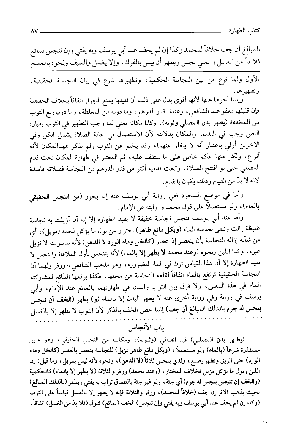 المبالغ أَن جف خلافًا لمُحَمد وَكَذَا إِن لم يجِف عِنْد أبي يُوسُف وَبِه يُفْتِي وَإِن تنجس بمائع فَلَا بدّ من الْغسْل والمني نجس ويطهر أَن يبس بالفرك، وَإِلَّا يغسل وَالسيف وَنَحْوه بِالْمَسْحِ