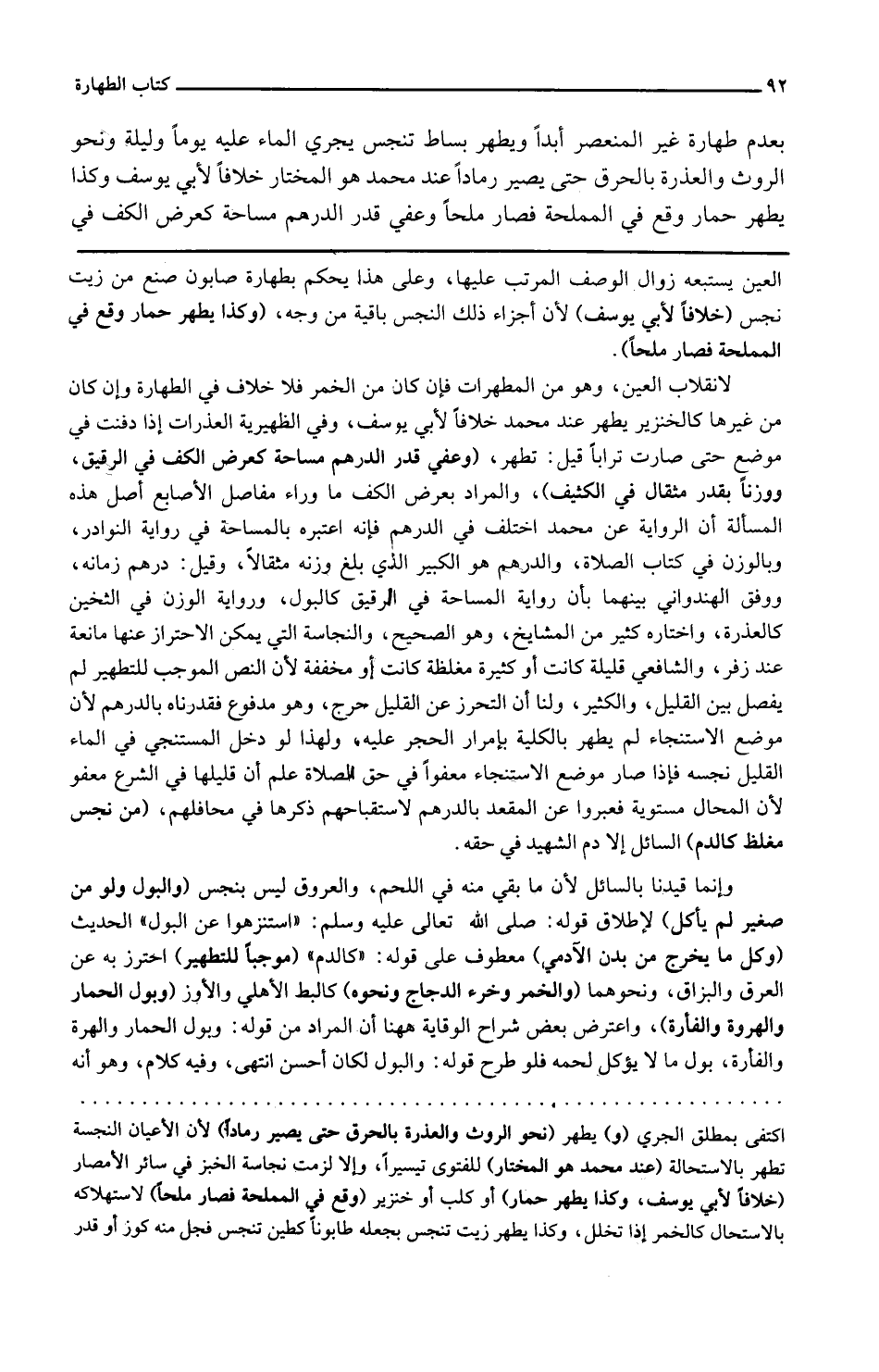 بِعَدَمِ طَهَارَة غير المنعصر أبدا ويطهر بِسَاط تنجس يجْرِي المَاء عَلَيْهِ يَوْمًا وَلَيْلَة وَنَحْو الروث والعذرة بالحرق حَتَّى يصير رَمَادا عِنْد مُحَمَّد هُوَ الْمُخْتَار خلافًا لأبي يُوسُف وَكَذَا يطهر حمَار وَقع فِي المملحة فَصَارَ ملحاً وعفي قدر الدِّرْهَم مساحة كعرض الْكَفّ فِي