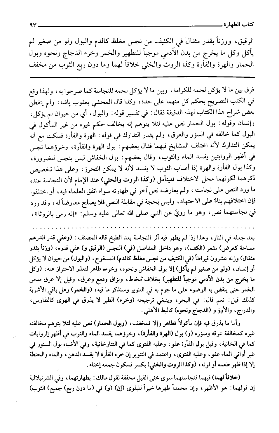 الرَّقِيق، ووزناً بِقدر مِثْقَال فِي الكثيف من نجس مغلظ كَالدَّمِ وَالْبَوْل وَلَو من صَغِير لم يَأْكُل وكل مَا يخرج من بدن الْآدَمِيّ مُوجبا للتطهير وَالْخمر وخرء الدَّجَاج وَنَحْوه وَبَوْل الْحمار والهرة والفأرة وَكَذَا الروث والخثي خلافًا لَهما وَمَا دون ربع الثَّوْب من مخفف