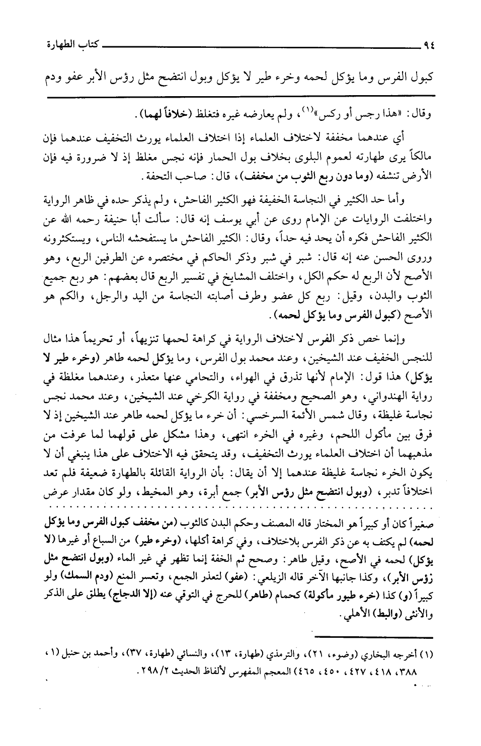 كبول الْفرس وَمَا يُؤْكَل لَحْمه وخرء طير لَا يُؤْكَل وَبَوْل انتضح مثل رُؤْس الأبر عَفْو وَدم