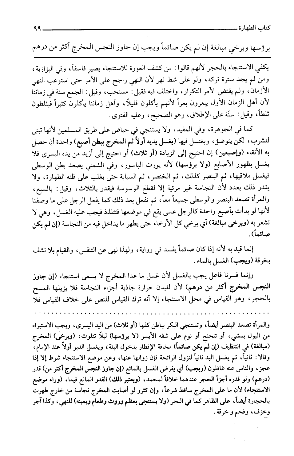 برؤسها ويرخي مُبَالغَة إِن لم يكن صَائِما وَيجب إِن جَاوز النَّجس الْمخْرج أَكثر من دِرْهَم