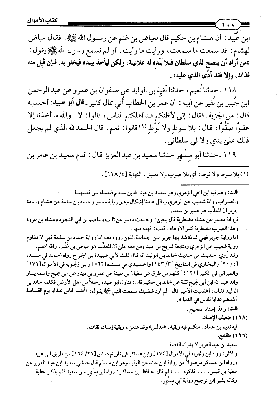 118 - (114) حَدَّثَنَا نُعَيْمٌ، حَدَّثَنَا بَقِيَّةُ بْنُ الْوَلِيدِ، عَنْ صَفْوَانَ بْنِ عَمْرٍو، عَنْ عَبْدِ الرَّحْمَنِ بْنِ جُبَيْرِ بْنِ نُفَيْرٍ، عَنْ أَبِيهِ، أَنَّ عُمَرَ بْنَ الْخَطَّابِ أُتِيَ بِمَالٍ كَثِيرٍ - قَالَ أَبُو عُبَيْدٍ: أَحْسِبُهُ، قَالَ: مِنَ الْجِزْيَةَ - فَقَالَ: «إِنِّي لَأَظُنُّكُمْ قَدْ أَهْلَكْتُمُ النَّاسَ»، قَالُوا: لَا وَاللَّهِ مَا أَخَذْنَا إِلَّا عَفْوًا صَفْوًا قَالَ: «بِلَا سَوْطَ وَلَا نَوْطَ؟» قَالُوا: نَعَمْ، قَالَ: «الْحَمْدُ لِلَّهِ الَّذِي لَمْ يَجْعَلْ ذَلِكَ عَلَى يَدَيَّ وَلَا فِي سُلْطَانِي».