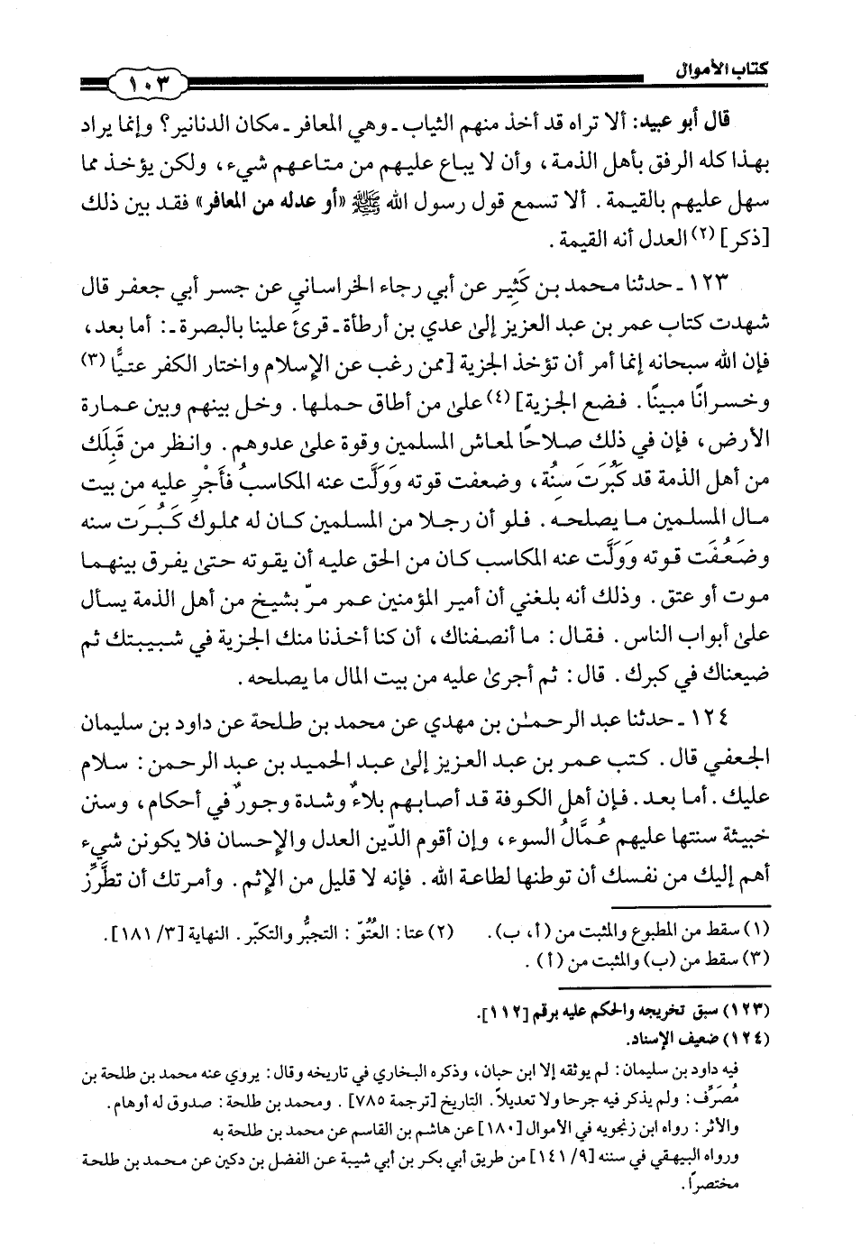 124 - (120) حُدِّثْنَا عَنْ عَبْدِ الرَّحْمَنِ بْنِ مَهْدِيٍّ، عَنْ مُحَمَّدِ بْنِ طَلْحَةَ، عَنْ دَاوُدَ بْنِ سُلَيْمَانَ الْجُعْفِيِّ، قَالَ: كَتَبَ عُمَرُ بْنُ عَبْدِ الْعَزِيزِ إِلَى عَبْدِ الْحَمِيدِ بْنِ عَبْدِ الرَّحْمَنِ: " سَلَامٌ عَلَيْكَ، أَمَّا بَعْدُ، فَإِنَّ أَهْلَ الْكُوفَةِ قَدْ أَصَابَهُمْ بَلَاءٌ وَشِدَّةٌ وَجَوْرٌ فِي أَحْكَامٍ، وَسُنَنٌ خَبِيثَةٌ سَنَّتْهَا عَلَيْهِمْ عُمَّالُ السُّوءِ، وَإِنَّ أَقْوَمَ الدِّينِ الْعَدْلُ وَالْإِحْسَانُ، فَلَا يَكُونَنَّ شَيْءٌ أَهَمَّ إِلَيْكَ مِنْ نَفْسِكِ أَنْ تُوَطِّنَهَا لِطَاعَةِ اللَّهِ، فَإِنَّهُ لَا قَلِيلٌ مِنَ الْإِثْمِ، وَأَمَرْتُكَ أَنْ تُطَرِّزَ #104# عَلَيْهِمْ أَرْضَهُمْ، وَأَنْ لَا تَحْمِلَ خَرَابًا عَلَى عَامِرٍ، وَلَا عَامِرًا عَلَى خَرَابٍ، وَلَا تَاخُذَ مِنَ الْخَرَابِ إِلَّا مَا يُطِيقُ، وَلَا مِنَ الْعَامِرِ إِلَّا وَظِيفَةَ الْخَرَاجِ، فِي رِفْقٍ وَتَسْكِينٍ لِأَهْلِ الْأَرْضِ، وَأَمَرْتُكَ أَنْ لَا تَاخُذَ فِي الْخَرَاجِ إِلَّا وَزْنَ سَبْعَةٍ، لَيْسَ لَهَا آسٌ، وَلَا أُجُورَ الضَّرَّابِينَ، وَلَا إِذَابَةَ الْفِضَّةِ، وَلَا هَدِيَّةَ النَّيْرُوزِ وَالْمَهْرَجَانِ، وَلَا ثَمَنَ الْمُصْحَفِ، وَلَا أُجُورَ الْبُيُوتِ، وَلَا دَرَاهِمَ النِّكَاحِ - قَالَ عَبْدُ الرَّحْمَنِ: أَوْ قَالَ النِّكَاحَ شك عبد الرحمن -، وَلَا خَرَاجَ عَلَى مَنْ أَسْلَمَ مِنْ أَهْلِ الْأَرْضِ، فَاتَّبِعْ فِي ذَلِكَ أَمْرِي، فَقَدْ أولَّيْتُكَ مِنْ ذَلِكَ مَا وَلَّانِي اللَّهُ، وَلَا تَعْجَلْ دُونِي بِقَطْعٍ وَلَا صَلْبٍ حَتَّى تُرَاجِعَنِي فِيهِ، وَانْظُرْ مَنْ أَرَادَ مِنَ الذُّرِّيَّةِ الْحَجَّ فَعَجِّلْ لَهُ مِائَةً يَتَجَهَّزُ بِهَا، وَالسَّلَامُ عَلَيْكَ " قَالَ عَبْدُ الرَّحْمَنِ: قَوْلُهُ: دَرَاهِمَ النِّكَاحِ، أَوِ النِّكَاحَ: يَعْنِي بِهِ بَغَايَا، كَانَ يُؤْخَذُ مِنْهُنَّ الْخَرَاجُ، قَالَ: وَقَوْلُهُ: الذُّرِّيَّةِ: يَعْنِي مَنْ كَانَ لَيْسَ مِنْ أَهْلِ الدِّيوَانِ.