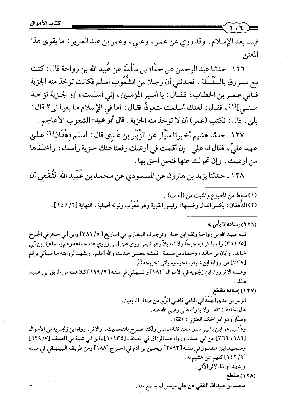 126 - (122) حَدَّثَنَا عَبْدُ الرَّحْمَنِ، عَنْ حَمَّادِ بْنِ سَلَمَةَ، عَنْ عُبَيْدِ اللَّهِ بْنِ رَوَاحَةَ، قَالَ: كُنْتُ مَعَ مَسْرُوقٍ بِالسِّلْسِلَةِ، فَحَدَّثَنِي أَنَّ رَجُلًا مِنَ الشُّعُوبِ أَسْلَمَ، فَكَانَتْ تُؤْخَذُ مِنْهُ الْجِزْيَةُ فَأَتَى عُمَرَ بْنَ الْخَطَّابِ، فَقَالَ: يَا أَمِيرَ الْمُؤْمِنِينَ، إِنِّي أَسْلَمْتُ، والجزية تؤخذ مني، فَقَالَ: «لَعَلَّكَ أَسْلَمْتَ مُتَعَوِّذًا»، فَقَالَ: أَمَّا فِي الْإِسْلَامِ مَا يُعِيذُنِي؟ قَالَ: «بَلَى»، قَالَ: فَكَتَبَ عُمَرُ «أَنْ لَا تُؤْخَذَ مِنْهُ الْجِزْيَةُ» قَالَ أَبُو عُبَيْدٍ: الشُّعُوبُ: الْأَعَاجِمُ.