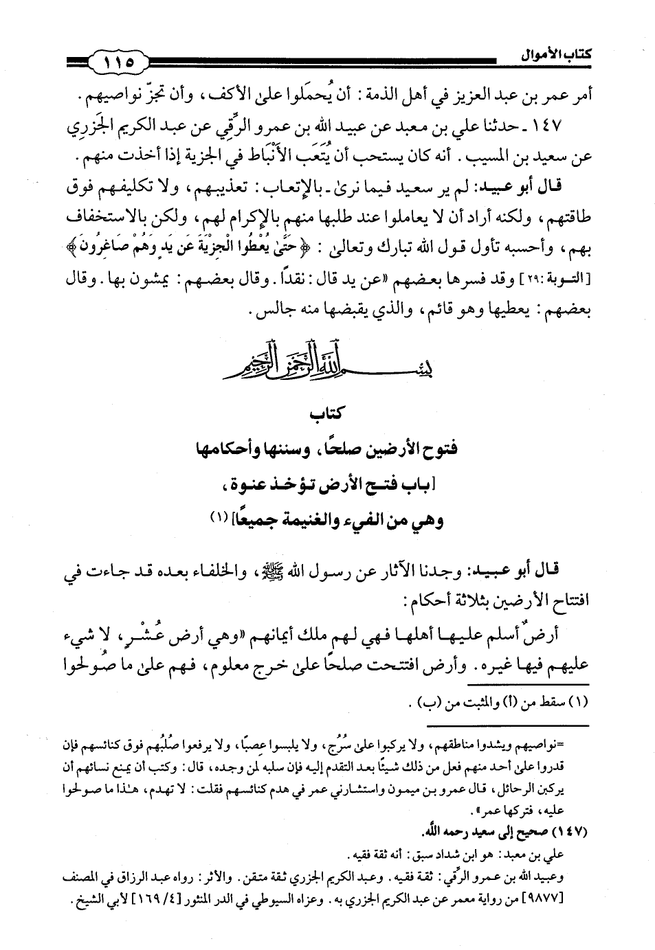 قَالَ أَبُو عُبَيْدٍ: وَجَدْنَا الْآثَارَ عَنْ رَسُولِ اللَّهِ صَلَّى اللهُ عَلَيْهِ وَسَلَّمَ، وَالْخُلَفَاءِ بَعْدَهُ قَدْ جَاءَتْ فِي افْتِتَاحِ الْأَرَضِينَ بِثَلَاثَةِ أَحْكَامٍ: أَرْضٌ أَسْلَمَ عَلَيْهَا أَهْلُهَا فَهِيَ لَهُمْ مِلْكُ أَيْمَانِهِمْ، وَهِيَ أَرْضُ عُشْرٍ، لَا شَيْءَ عَلَيْهِمْ فِيهَا غَيْرُهُ، وَأَرْضٌ افْتُتِحَتْ صُلْحًا عَلَى خَرْجٍ مَعْلُومٍ، فَهُمْ عَلَى مَا صُولِحُوا #116# عَلَيْهِ، لَا يَلْزَمُهُمْ أَكْثَرُ مِنْهُ، وَأَرْضٌ أُخِذَتْ عَنْوَةً، فَهِيَ الَّتِي اخْتَلَفَ فِيهَا الْمُسْلِمُونَ، فَقَالَ بَعْضُهُمْ: سَبِيلُهَا سَبِيلُ الْغَنِيمَةِ، فَتُخَمَّسُ وَتُقَسَّمُ، فَيَكُونُ أَرْبَعَةُ أَخْمَاسِهَا خُطَطًا بَيْنَ الَّذِينَ افْتَتَحُوهَا خَاصَّةً، وَيَكُونُ الْخُمُسُ الْبَاقِي لِمَنْ سَمَّى اللَّهُ تَبَارَكَ وَتَعَالَى. وَقَالَ بَعْضُهُمْ: بَلْ حُكْمُهَا وَالنَّظَرُ فِيهَا إِلَى الْإِمَامِ: إِنْ رَأَى أَنْ يَجْعَلَهَا غَنِيمَةً، فَيُخَمِّسَهَا وَيُقَسِّمَهَا، كَمَا فَعَلَ رَسُولُ اللَّهِ صَلَّى اللهُ عَلَيْهِ وَسَلَّمَ بِخَيْبَرَ، فَذَلِكَ لَهُ، وَإِنْ رَأَى أَنْ يَجْعَلَهَا فَيْئًا فَلَا يُخَمِّسَهَا وَلَا يُقَسِّمَهَا، وَلَكِنْ تَكُونُ مَوْقُوفَةً عَلَى الْمُسْلِمِينَ عَامَّةً مَا بَقُوا، كَمَا صَنَعَ عُمَرُ بِالسَّوَادِ، فَعَلَ ذَلِكَ فَهَذِهِ أَحْكَامُ الْأَرْضِ الَّتِي تُفْتَحُ فَتْحًا، فَأَمَّا الْأَرْضُ الَّتِي يَقْطَعُهَا الْإِمَامُ إِقْطَاعًا، أَوْ يَسْتَخْرِجَهَا الْمُسْلِمُونَ بِالْإِحْيَاءِ، أَوْ يَحْتَجِزُهَا بَعْضُهُمْ دُونَ بَعْضٍ بِالْحُمَّى، فَلَيْسَتْ مِنَ الْفُتُوحِ، وَلَهَا أَحْكَامٌ سِوَى تِلْكَ وَبِكُلِّ هَذَا قَدْ جَاءَتِ الْأَخْبَارُ عَنِ النَّبِيِّ صَلَّى اللهُ عَلَيْهِ وَسَلَّمَ وَأَصْحَابُهُ