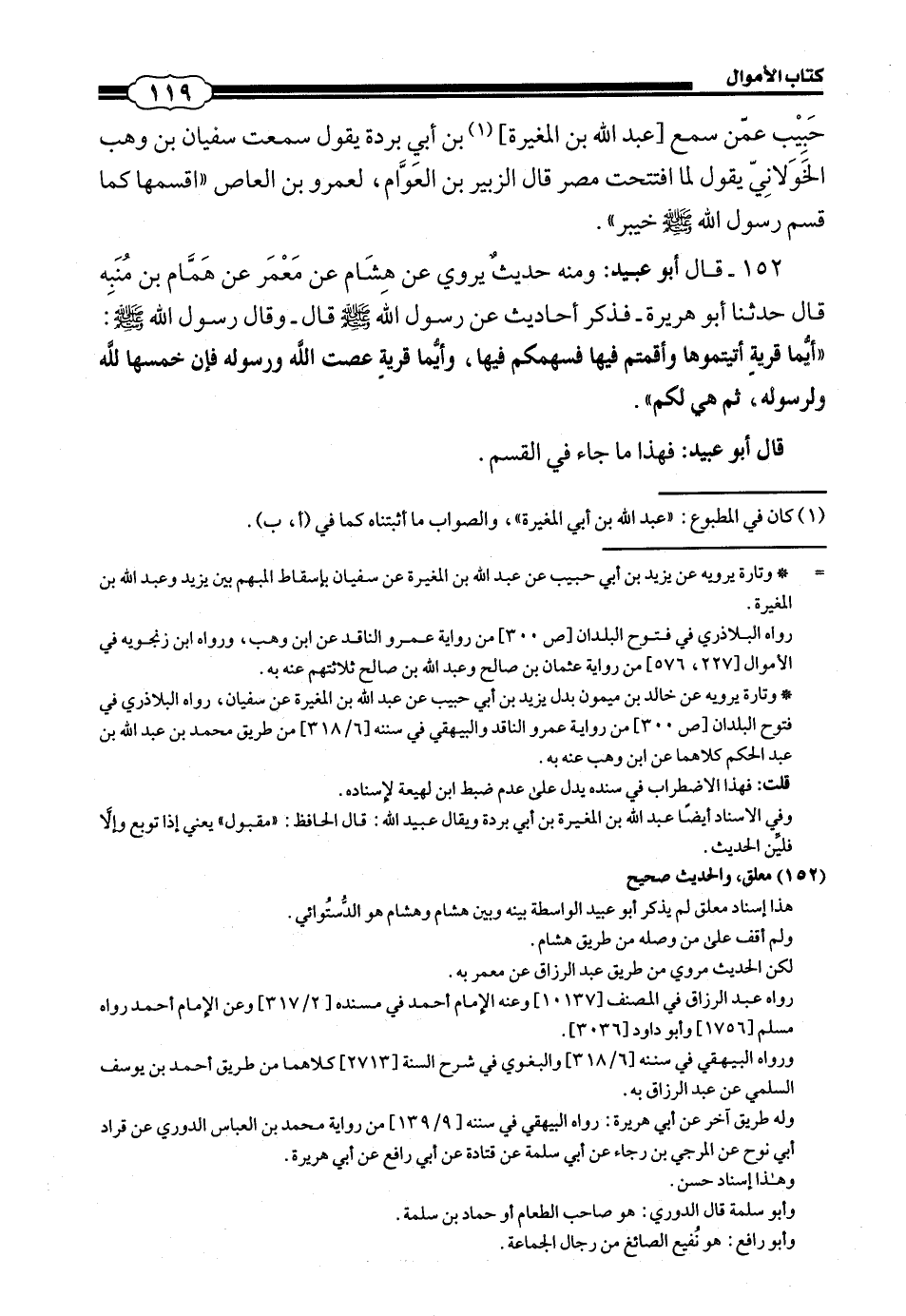 152 - (145) قَالَ أَبُو عُبَيْدٍ: وَمِنْهُ حَدِيثٌ يُرْوَى عَنْ هِشَامٍ، عَنْ مَعْمَرٍ، عَنْ هَمَّامِ بْنِ مُنَبِّهِ، قَالَ: حَدَّثَنَا أَبُو هُرَيْرَةَ، فَذَكَرَ أَحَادِيثَ عَنْ رَسُولِ اللَّهِ صَلَّى اللهُ عَلَيْهِ وَسَلَّمَ، قَالَ وَقَالَ رَسُولُ اللَّهِ صَلَّى اللهُ عَلَيْهِ وَسَلَّمَ: أَيُّمَا قَرْيَةٍ أَتَيْتُمُوهَا وَأَقَمْتُمْ فِيهَا فَسَهْمُكُمْ فِيهَا، وَأَيُّمَا قَرْيَةٍ عَصَتِ اللَّهَ وَرَسُولَهُ فَإِنَّ خُمُسَهَا لِلَّهِ وَلِرَسُولِهِ، ثُمَّ هِيَ لَكُمْ قَالَ أَبُو عُبَيْدٍ: فَهَذَا مَا جَاءَ فِي الْقَسْمِ.