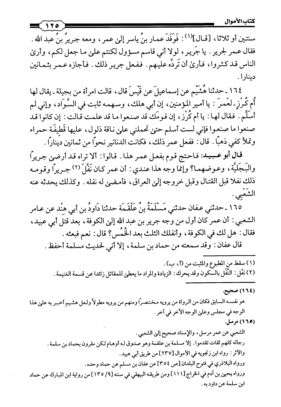 قَالَ أَبُو عُبَيْدٍ: فَاحْتَجَّ قَوْمٌ بِفِعْلِ عُمَرَ هَذَا قَالُوا: أَلَا تَرَاهُ قَدْ أَرْضَى جَرِيرًا وَالْبَجَلِيَّةَ، وَعَوَّضَهُمَا؟ وَإِنَّمَا وَجْهُ هَذَا عِنْدِي: أَنَّ عُمَرَ كَانَ نَفَّلَ جَرِيرًا وَقَوْمَهُ ذَلِكَ نَفَلًا قَبْلَ الْقِتَالِ وَقَبْلَ خُرُوجِهِ إِلَى الْعِرَاقِ، فَأَمْضَى لَهُ نَفَلَهُ، وَكَذَلِكَ يُحَدِّثُهُ عَنْهُ الشَّعْبِيِّ.